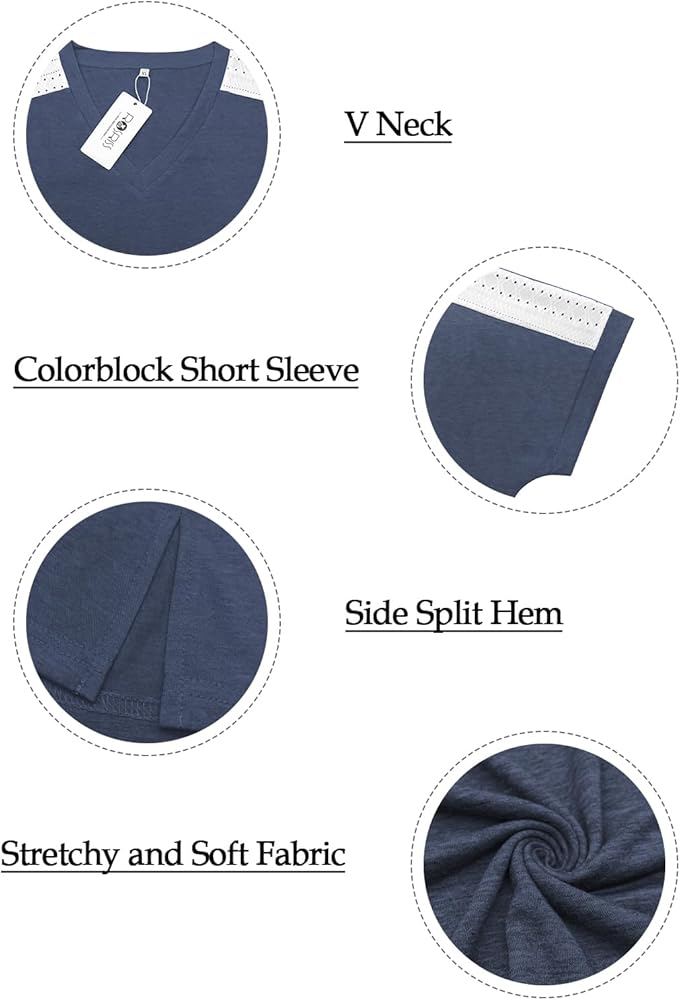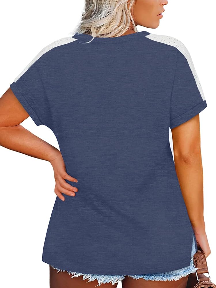 - Plus size tops for women feature short sleeve, v neck, side split, raglan sleeves and color block detail