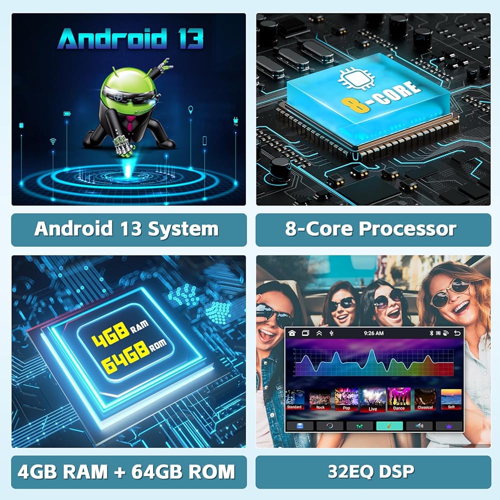 【Powerful Processor】 The Latest Android 13 system with powerful 8-core processor provide you with a smarter and more efficient services. 4G RAM ensures that the car radio runs smoothly, and 64G ROM allows you to download and install multiple apps that you like through the store, like Youtube, Soptify, Pandora, etc.