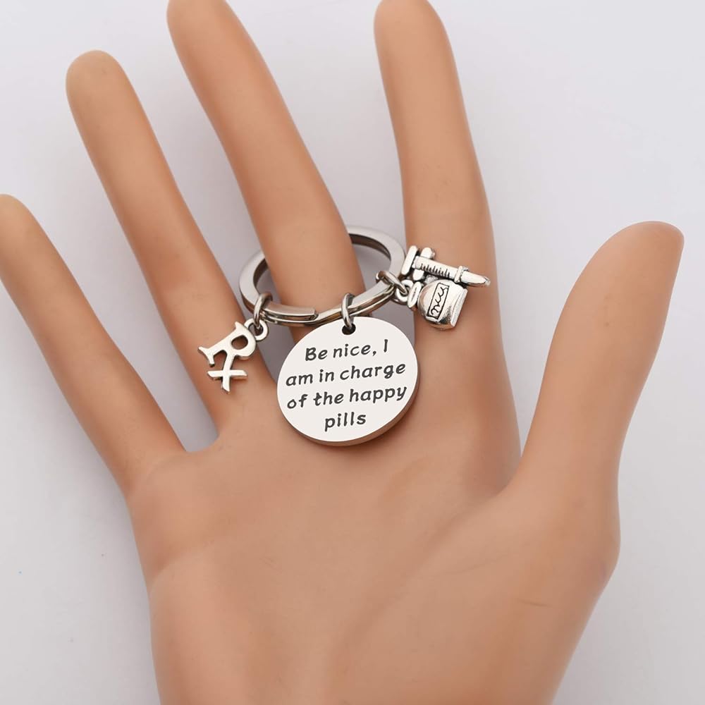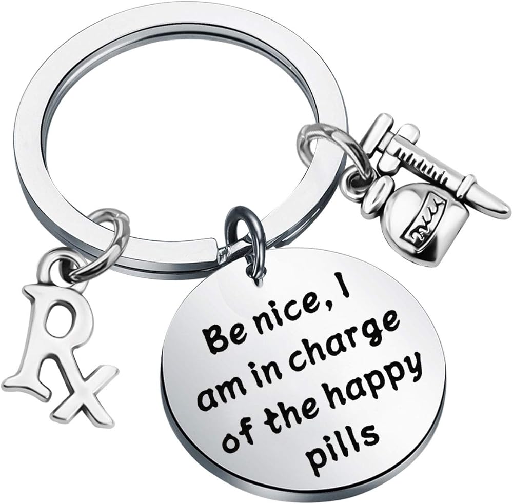 Pharmacist Keychain - engraved with"Be Nice, I Am in Charge of the Happy Pills".A wonderful gift for a special pharmacist, even if you are that pharmacist.Perfect gift for pharmacy technician, Pharmacy Student Gift, Pharmacist Graduate Gift.