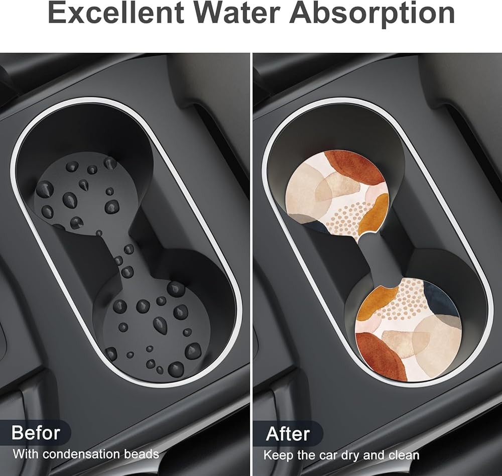 【Super Absorbent Coasters】 Our car cup holder coaster are made of high-quality marble ceramics, and adopts a unique process and has excellent water absorption. The ceramic car coasters provide more absorbent than other coaster made of all-cork, leather, paper, cardboard, rubber. It can quickly absorb all condensation, spilled coffee and cola stains in 10-15 seconds, keep the car dry, clean and not easy to mold.
