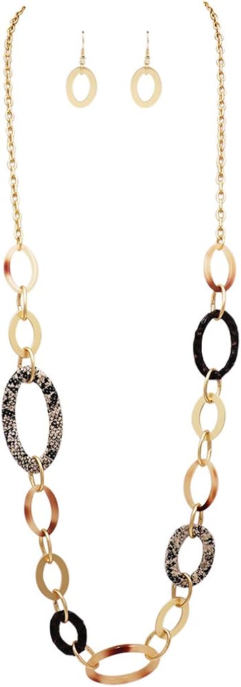 Lightweight trendy necklaces in two style both with matte gold tone rings with gold tone hardware linking them together and either faux snake skin and tortise print lucite or cork inlay with rainbow glitter balls and faceted cream-colored glass beads.
