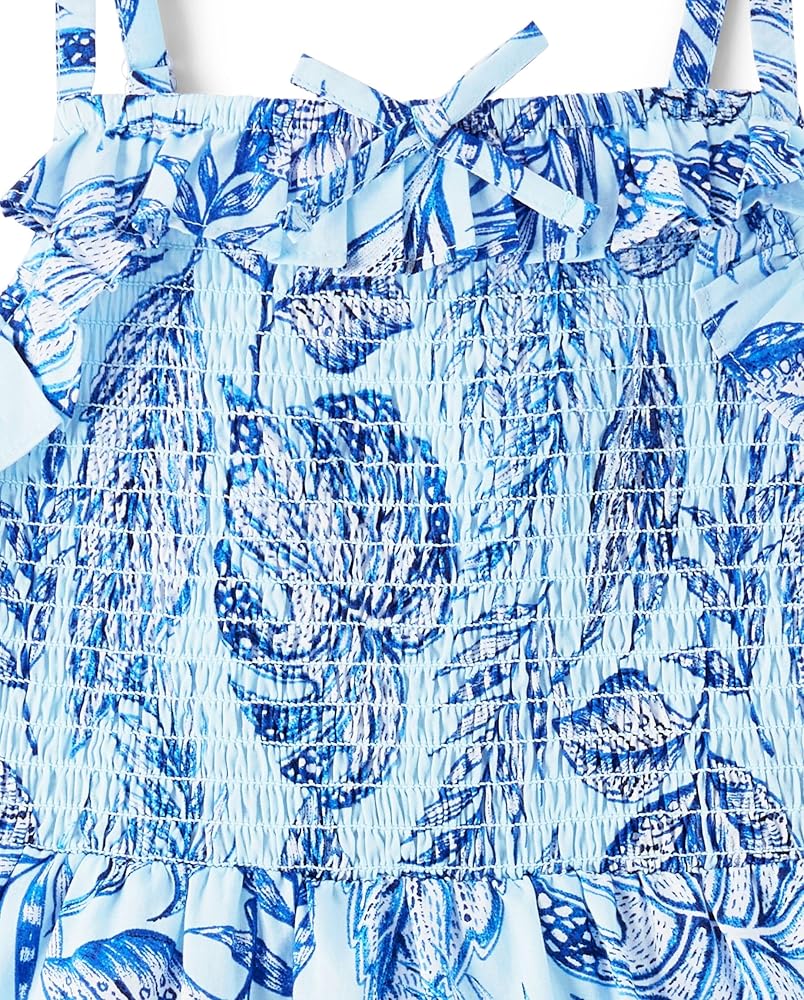 DESIGN — Features off-shoulder neck with smocked bodice, adjustable shoulder straps with puff sleeves, ruffle hem, above-the-knee length and allover floral print