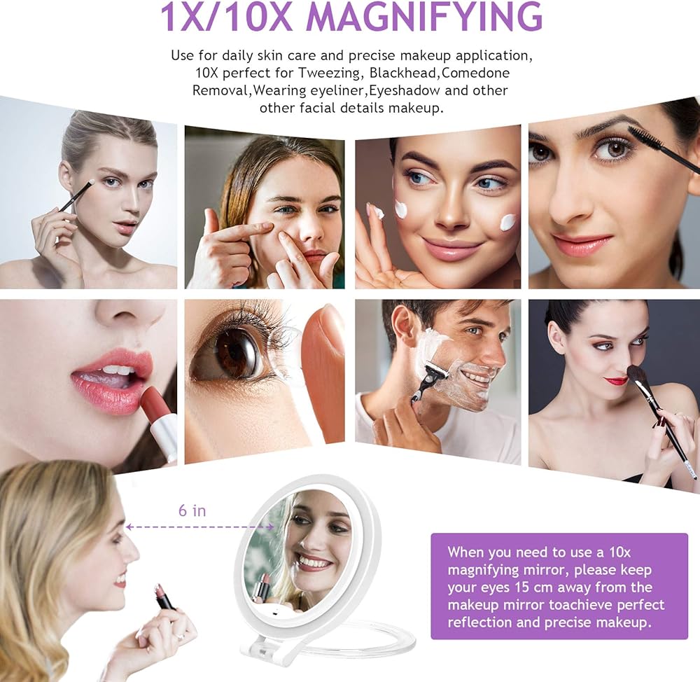 【 Magnification 10X/1X 】: One side magnifies 10X, which can perfectly help you on precise makeup application, like eyebrow tweezing, blackhead, blemish removal, wearing eyeliner and so many other details of makeup. The other side is 1X (No magnification), you can watch the full face effect after makeup.