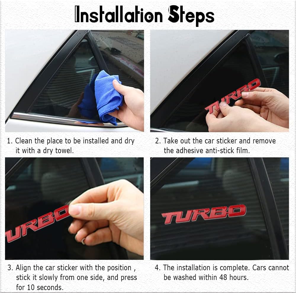 [Easy to install]: 1. Clean the position to be pasted and keep it dry. 2. Peel off 3M and align it with the position to be pasted. 3. Press for about 1 minute to ensure that the 3M adhesive on the Turbo Car Emblem is well bonded.
