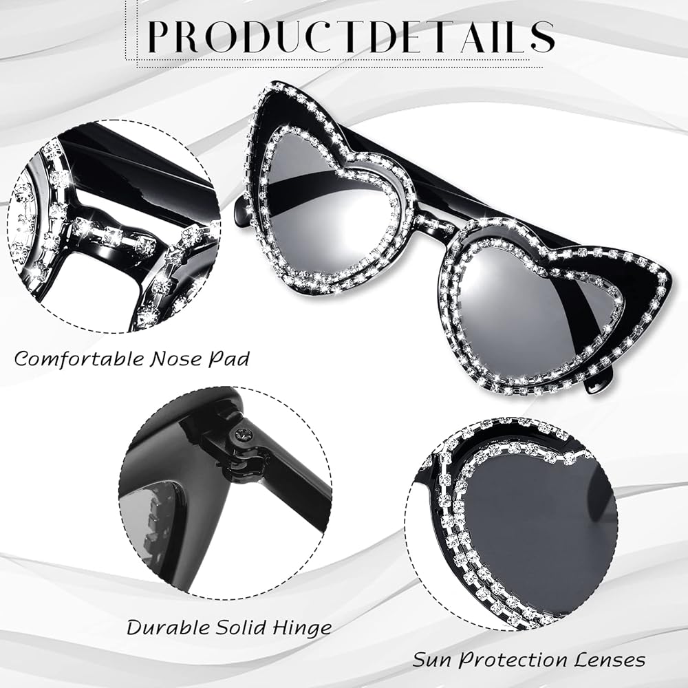 Quality and Lightweight Material: our heart shaped glasses are made of quality lenses and PC frame, proper in size, light in weight, wear resistant, sturdy and reliable, not easy to break, deform or fade, serving you for a long time; The frames are decorated with bling rhinestones, shiny and charming