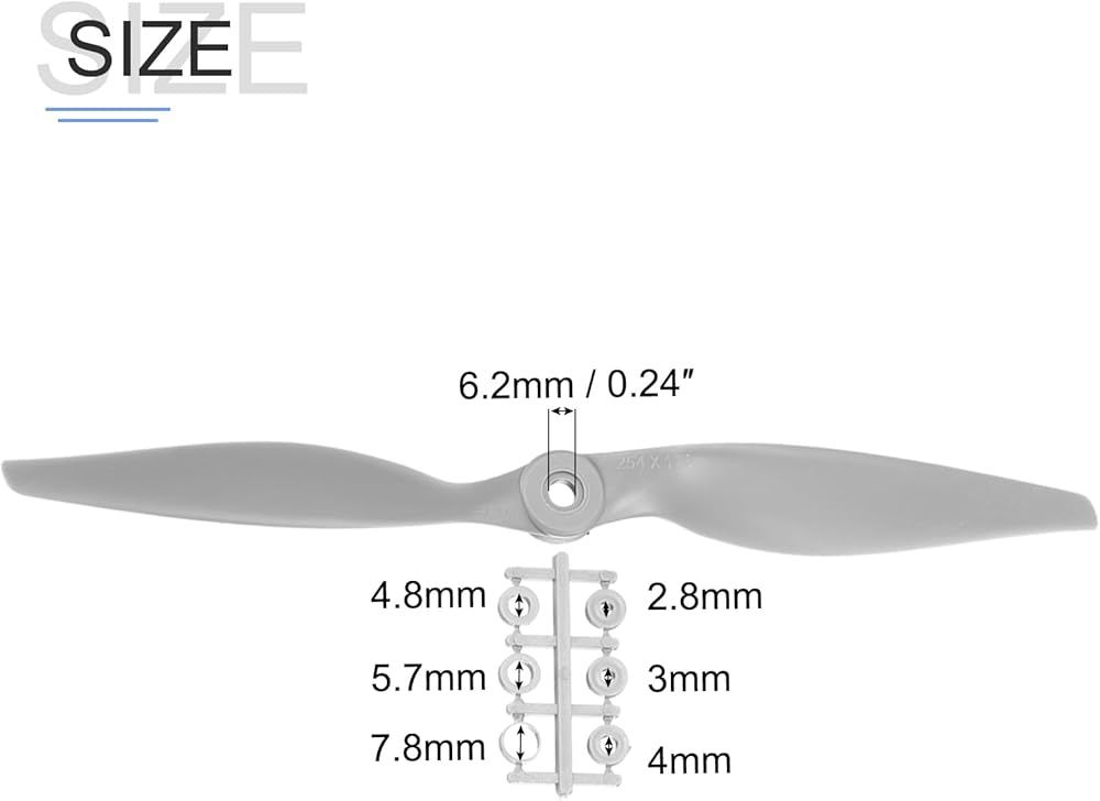 • Propeller Diameter: 7 inch; Pitch: 5 inch; Hole Diameter: 6.5mm/0.26 inch; Propeller Washers Size: 6mm/5mm/4mm/3mm; Root Thickness: 8.8mm/0.35 inch; Vane Quantity: 2