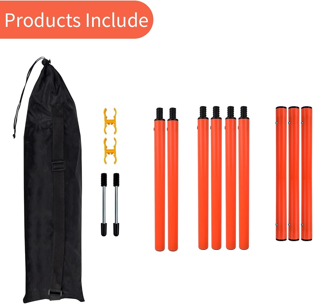 【Package Included】This dog agility training equipment is made of ABS material, included 2 weaving poles(length 41in, need assemble) with steel spike(length 6in) for inserting into the ground,1 jump hurdle (length 43in) and 2 adjustable clips.