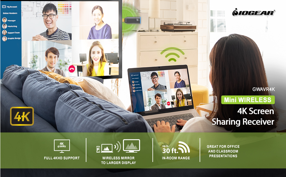 IOGEAR Mini Wireless 4K HDMI Video Screen Sharing Adapter - Wireless 2.4/5GHz w/WPA-2 Security - Up to 30Ft - Low Latency - Phone, Tablet, PC - Win Mac OS iOS Android Chrome - GWAVR4K