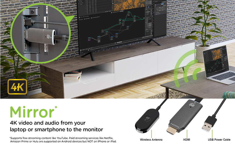 Wirelessly cast content from your laptop, phone to your 4K UHDTV, projector or monitor. Simply connect the receiver to your TV and follow the simple onscreen instruction