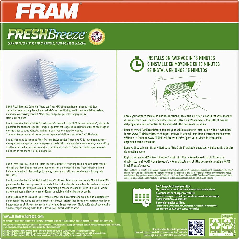 FRAM Fresh Breeze cabin air filters are the only cabin air filters built with Arm & Hammer baking soda combined with carbon embedded in the filter. Cabin air filters have proven to be essential as air quality can be severely affected by wildfire smoke, pollen, dirt, and other irritants. It is important to replace your cabin air filter periodically to help keep the air in your vehicle clean.