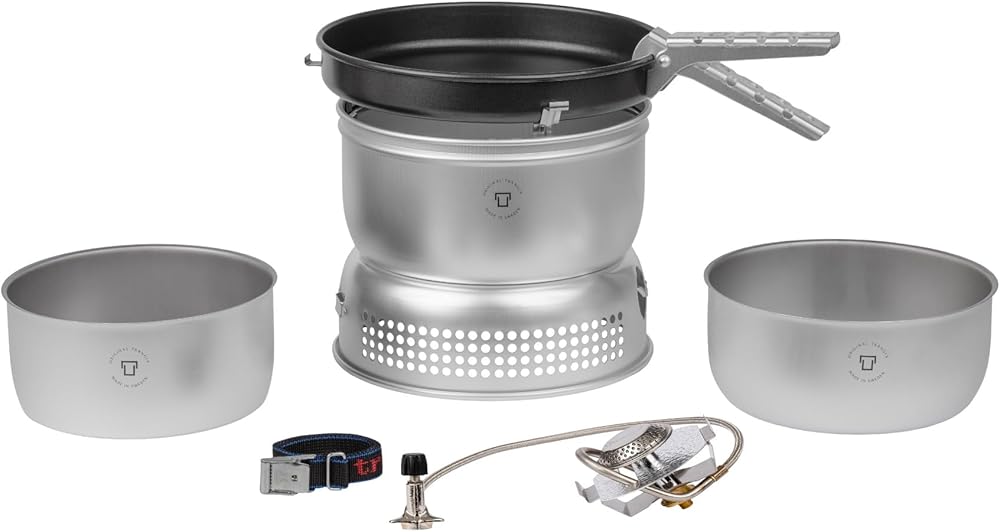 Stove with 2 Duossal saucepans, 1.5 and 1.75 liters, 1 nonstick frypan, 8.7", and ultralight aluminum upper and lower windshields. Includes a spirit burner, pan grip, and strap.