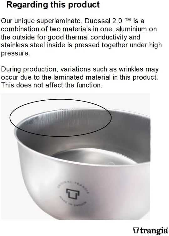 Trangia's unique super laminate. Duossal 2.0 is a perfect combination of two materials in one, pressed together under high pressure. Aluminium on the outside for good thermal conductivity, and stainless steel inside, which makes the pans scratch resistant and easy to clean.
