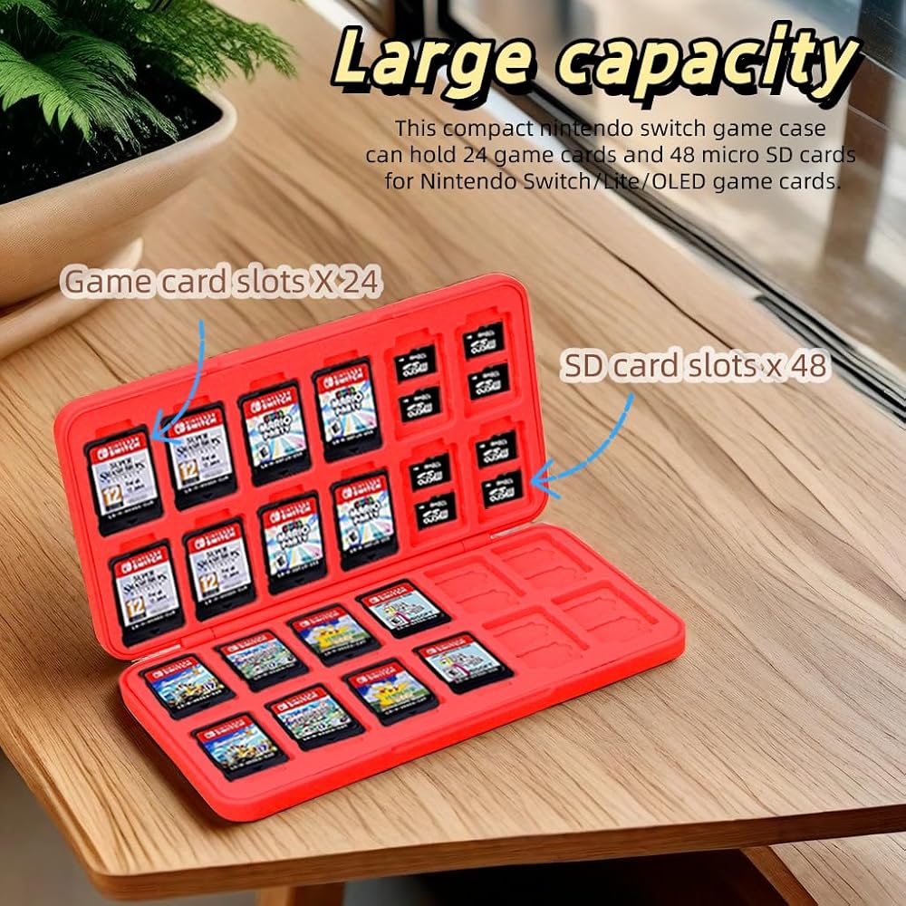 【Sufficient Capacity】24 card slots & 48 micro SD card slots. This compact nintendo switch game case can hold 24 game cards and 48 micro SD cards for Nintendo Switch/Lite/OLED game cards.