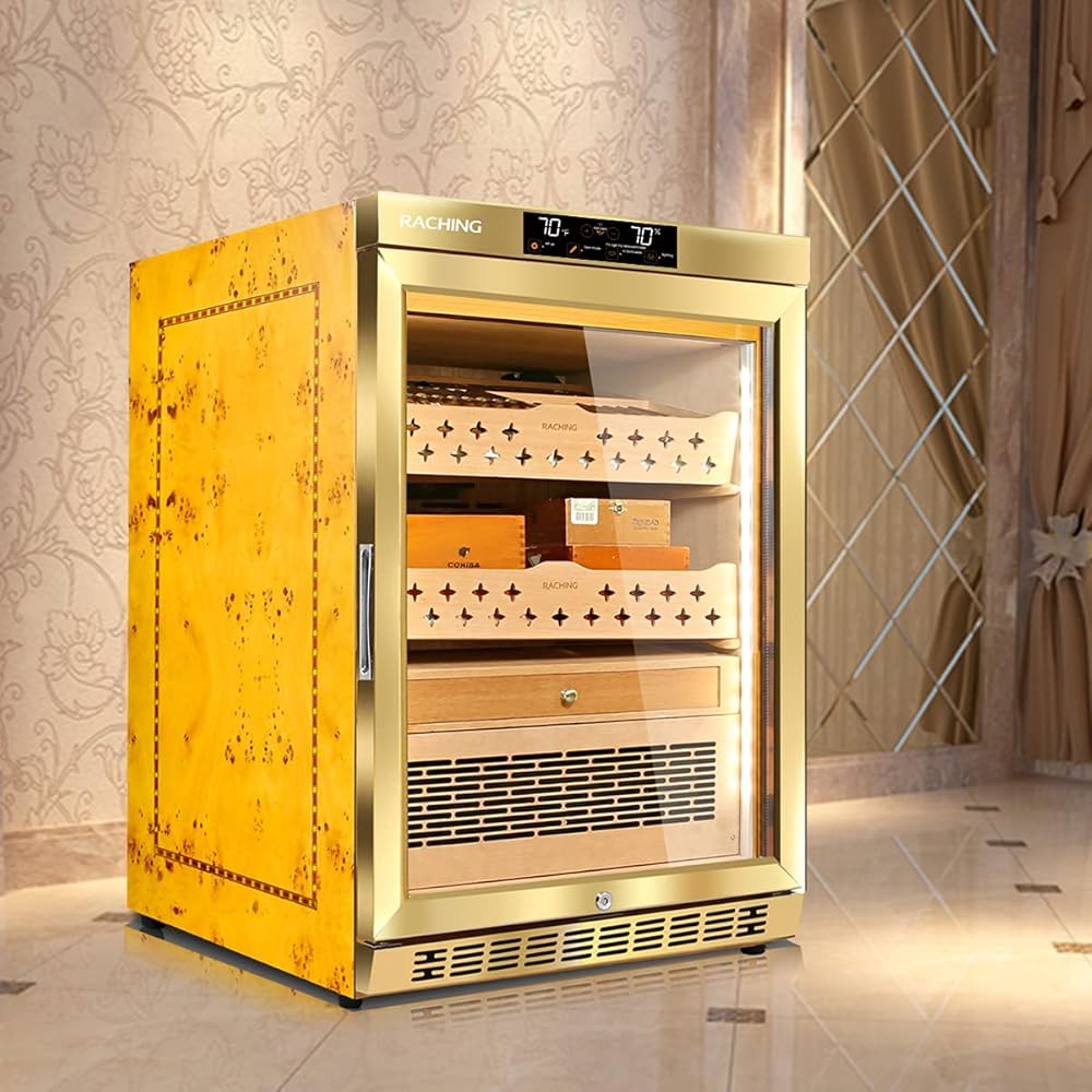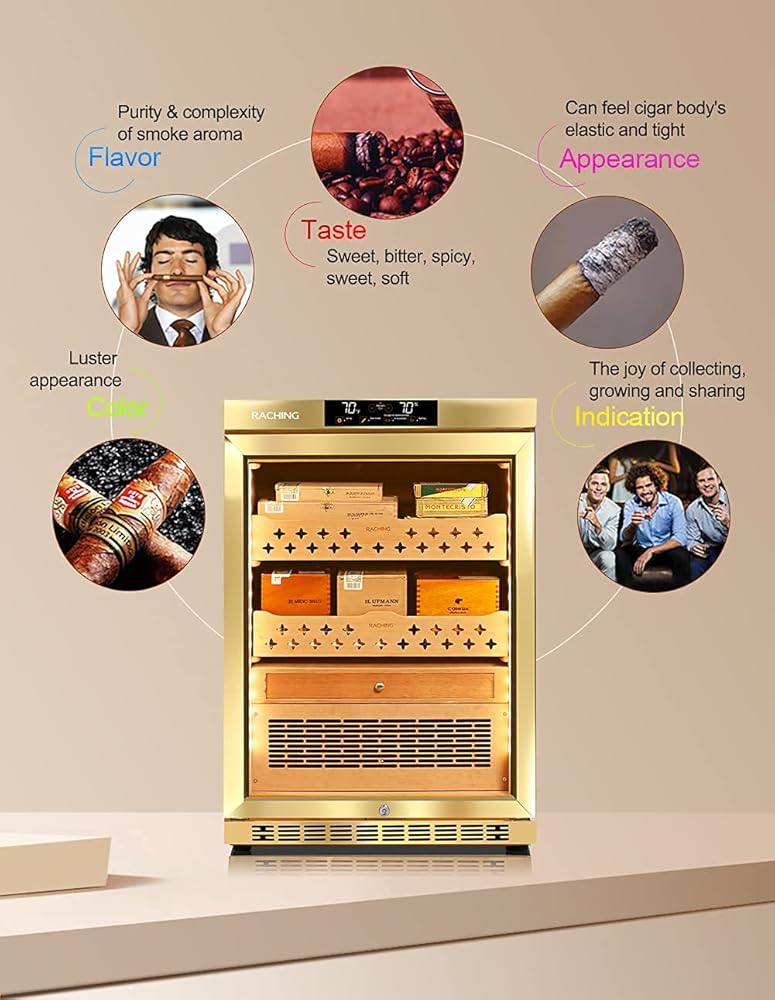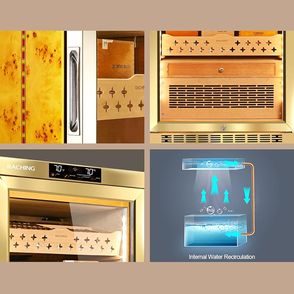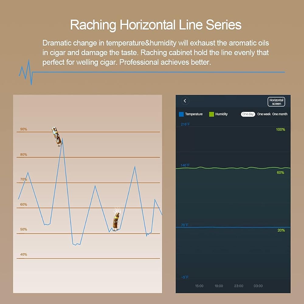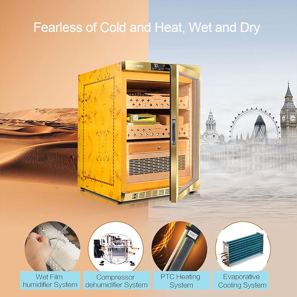 🚬CIGAR STORE&AGING: The cabinet has build-in humidity, fan cooling, PTC Heating & dehumidify system which contributes a constant temperature and humidity environment to keep your cigar at the best status. Perfect for store and aging your cigar.