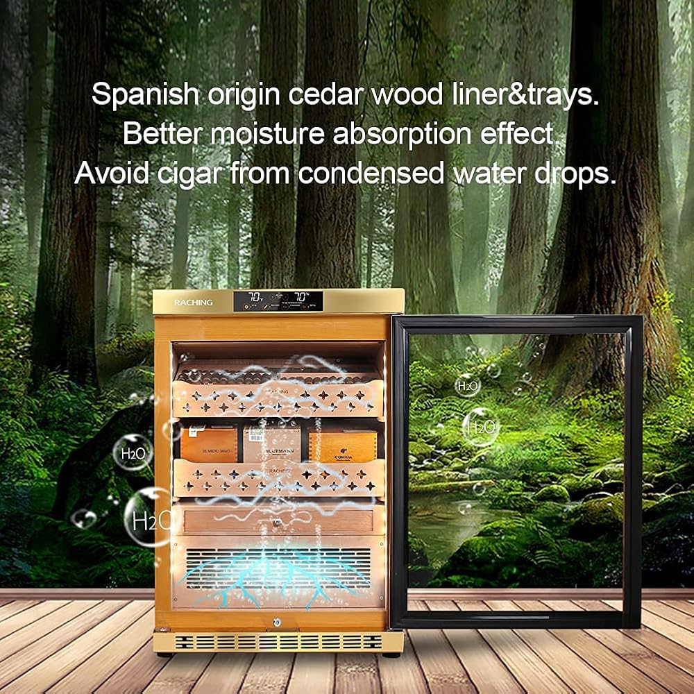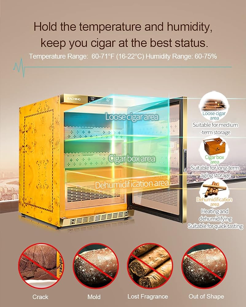 🚬EASY CONTROL: Simply set the number you want on panel, the cabinet will monitoring and keep the inside temperature&humidity smoothly. Best Temperature Range: 60-71°F (16-22°C) ; Best Humidity: 60-75% . Keep your cigar away from damp, crack.