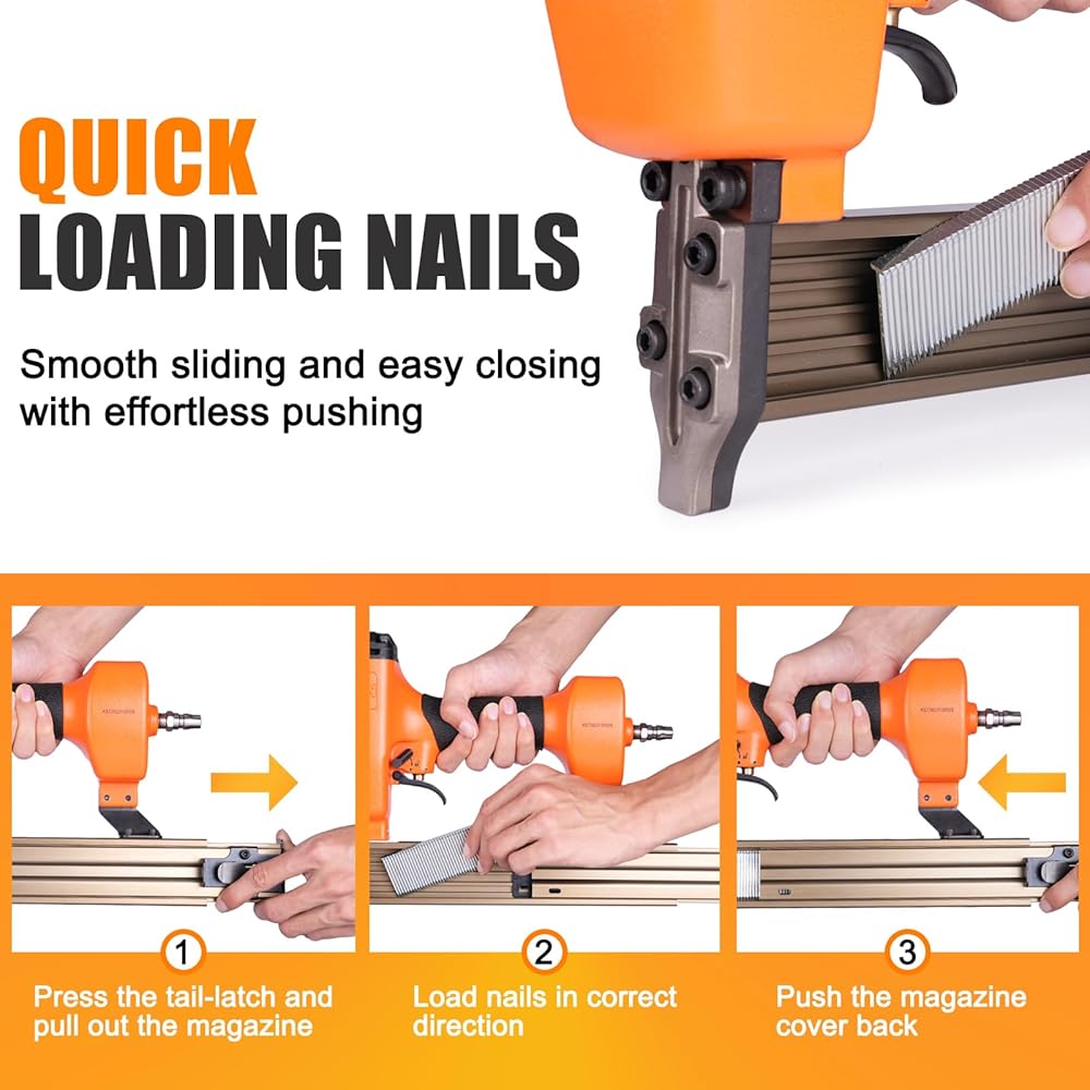 【Magnetic Nozzle & Quick Loading: 】The nozzle is magnetic and is able to attract nails. At the same time,side-loading magazine with tail-latch release design offers quick loading & replenishing. All for the sake of efficiency.