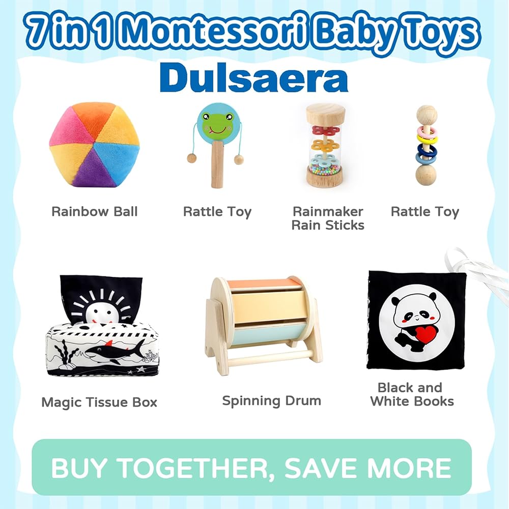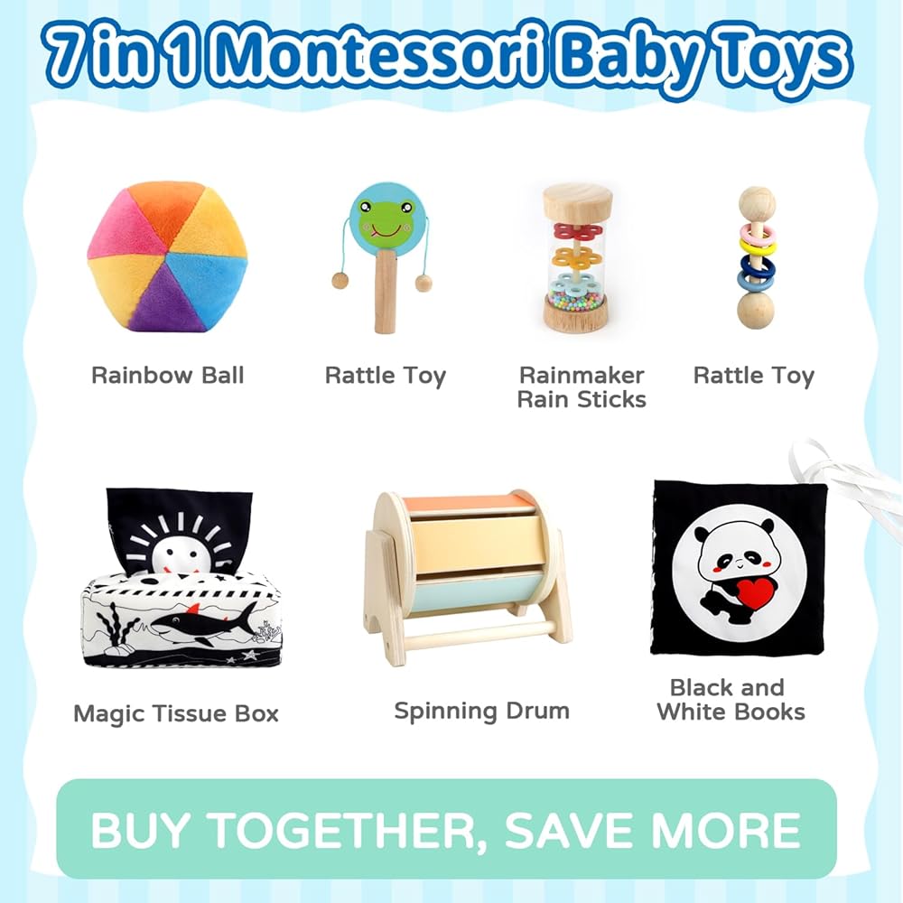Montessori Toys for Babies 0-6 Months, 7 in 1 Learning Educational Set Newborn Toys 6-12 Months, Rainbow Ball, Baby Black and White Books, Tissue Box Toy, Spinning Drum, Rattle Toy