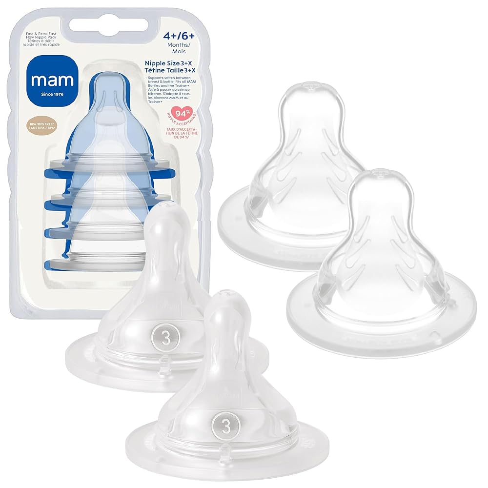 MAM's nipples are designed to resemble a mother's nipple during breastfeeding. To achieve this, MAM observed 16 infants breastfeeding using ultrasound technology*. The result is a unique, flat shaped nipple that fits perfectly in baby's mouth and makes the switch back-and-forth between breast and bottle easy. All MAM products are made from BPA-free materials for maximum safety. These nipples fit all MAM bottles and are suitable for both breast milk and formula. The MAM nipple is available in five different flow rates: 0 – extra slow flow (newborn), 1 - slow flow (0+ months), 2 - medium flow (2+ months), 3 - fast flow (4+ months), and x - extra fast flow for thicker liquids (6+ months). *Market research 2010-2020, tested with 1,572 babies