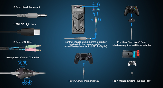COMPATIBILITY: Gaming Headset compatible with 3.5mm interface devices such as PS4/PS5/PC/Nintendo Switch/Xbox One S/Laptop/Phone.
