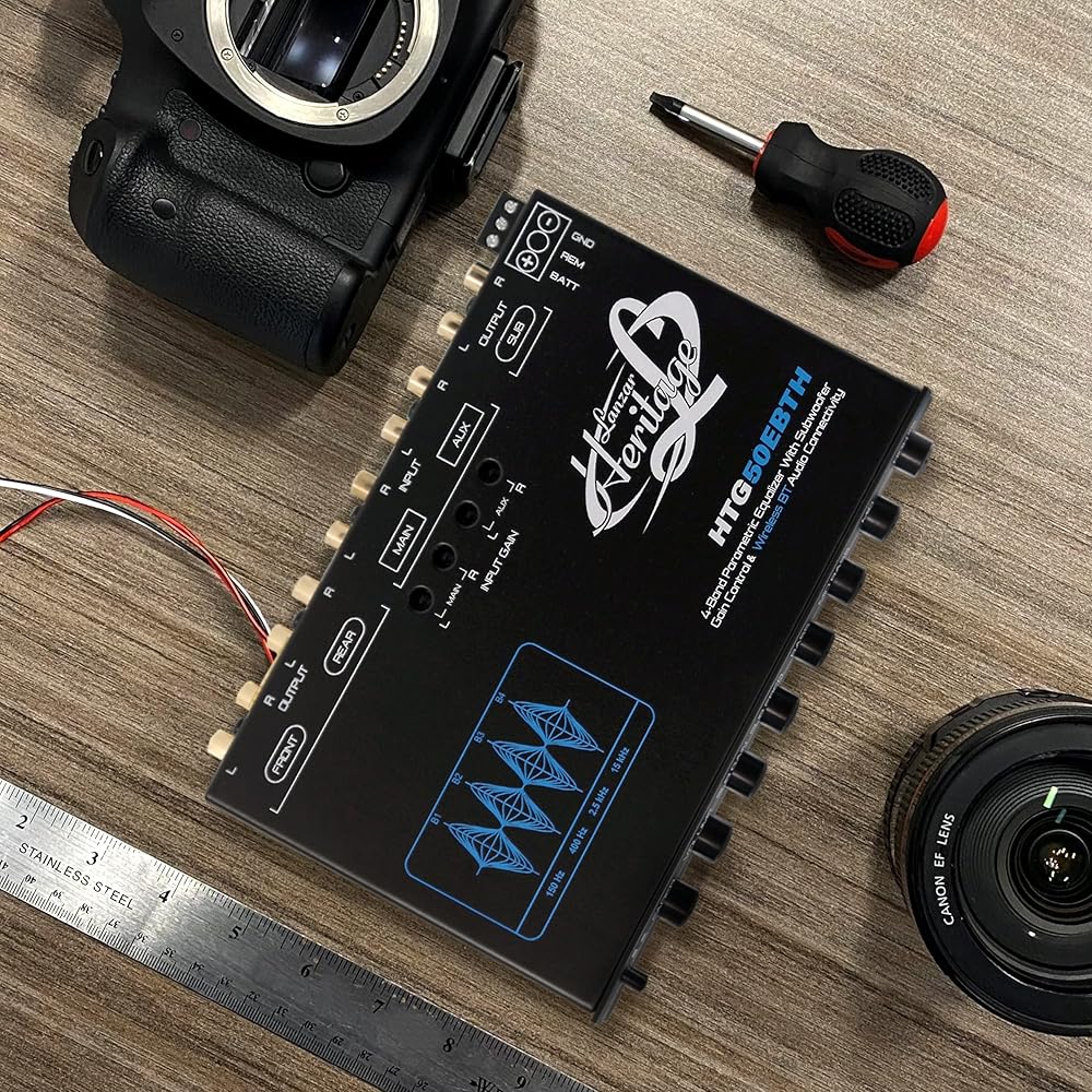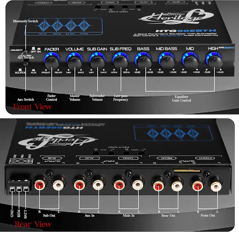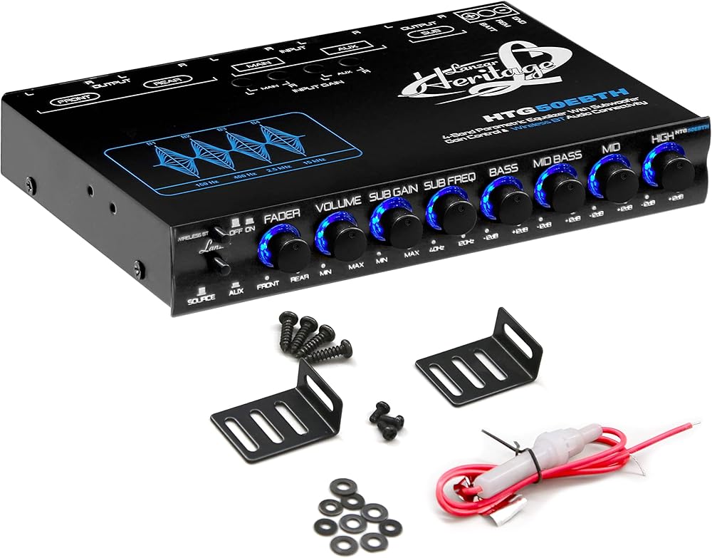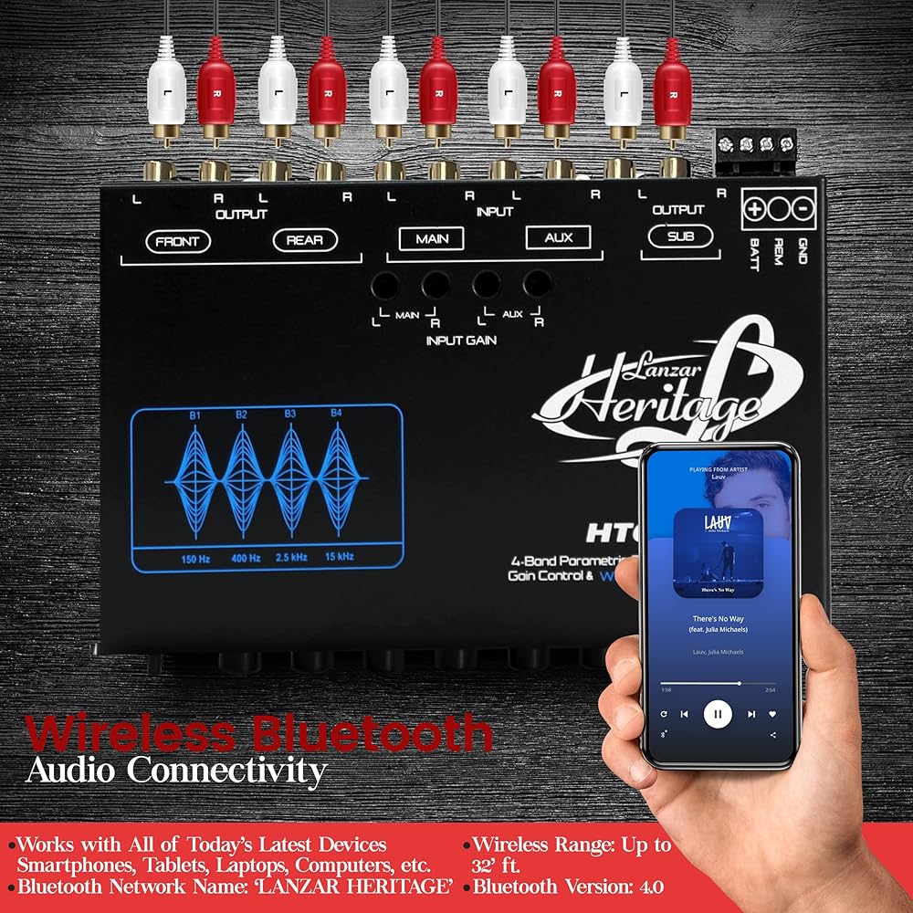 4 Band Parametric Equalizer, Half Din Size, 9 Volt RMS Pre-Amp Output, Pre-amp Line Aux Inputs Via RCA Jacks, 3 Input Source Selectable, Input Gain Adjustments, Wireless Bluetooth Audio Connectivity, RCA AUX Input Jack, Source/Aux/ BT Input Selector, Rotary Fader, Output Volume Control, Sub Output Volume Control, Blue Light Illumination, Mounting Hardware Included, DC 12 Volt with Remote Trigger, Built-in Bluetooth for Wireless Music Streaming, Simple & Hassle-Free Pairing, Works with All of Today's Latest Devices, Smartphones, Tablets, Laptops, Computers, etc., Bluetooth Version: 4.0, Bluetooth Network Name: ‘LANZAR HERITAGE', Wireless Range: Up to 32' ft., 4-Band Parametric Equalizer, Construction Material: Iron and aluminium, Power Output: DC 12V, Pre-Amp Output: 9V RMS, Power Dimensions (L x W x H): 7'' x 5'' x 1.1'' -inches, Weight: 1.32 lbs.