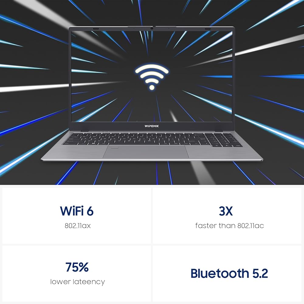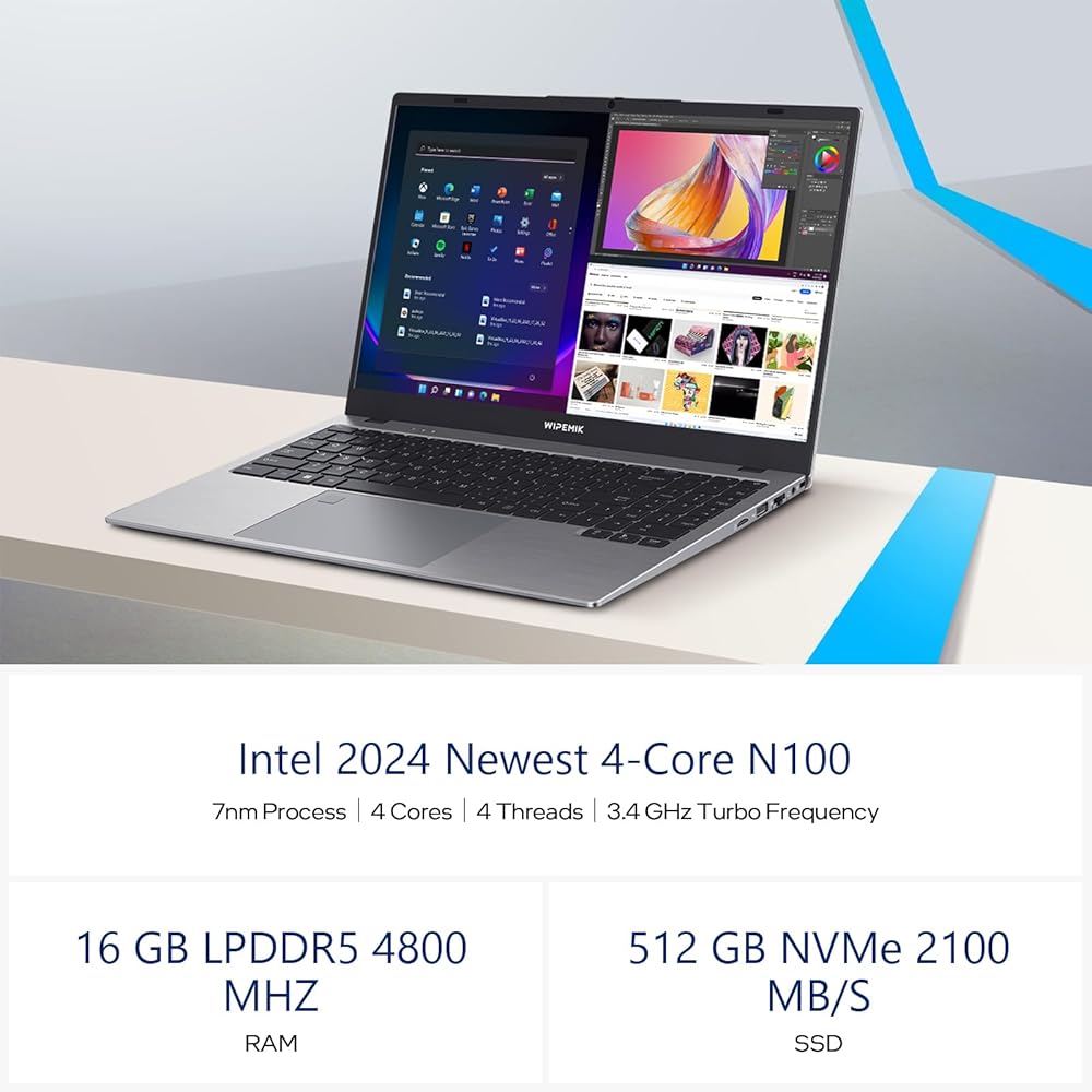 16GB RAM 512GB SSD - WIPEMIK P15 laptop computer maximize your multitasking and productivity with the newest Intel Core N100 Processor 4 Cores 4 Threads, up to 3.4 GHz. With 16GB 4800 MHz LPDDR5 memory and 512GB 2100 MB/S M.2 NVMe SSD storage it only takes a few seconds to boot up, Bring you a faster response and meet your more needs.