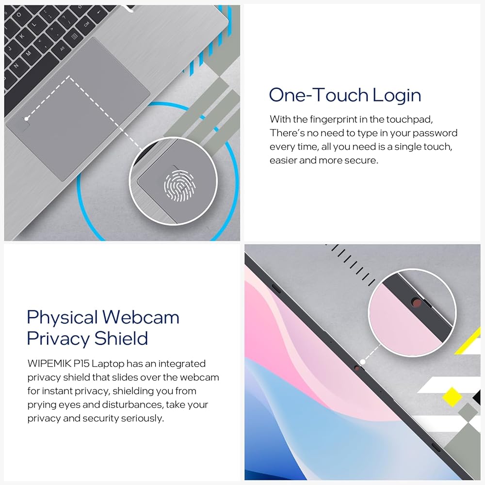 UNIQUE DESIGN - WIPEMIK P15 laptop has a physical cover obscures webcam for an assurance of instant privacy, a fingerprint recognition, just tap the button to switch on and log in, no difficult-to-remember passwords, 3 unique shortcut keys, One-click shortcut to open Intel Unison to connect with your phone. Transfer files & photos from your laptop, 2 customizable shortcut for quickly opening browser favorites, you can get what you want faster.