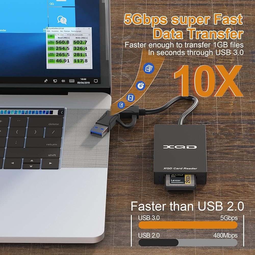 【 قارئ بطاقات XQD/SD 2 في 1 】 يدعم قارئ بطاقات XQD SD ثنائي الفتحة القراءة المتزامنة لبطاقات XQD وSD. مصمم خصيصًا للمصورين، وهو خيار رائع لنقل الملفات بين جهازك وبطاقة الذاكرة. بالإضافة إلى ذلك، يمكن لقارئ البطاقات هذا قراءة وكتابة بطاقات XQD وSD في نفس الوقت، مما يمكن أن يحسن كفاءة عملك بشكل كبير.