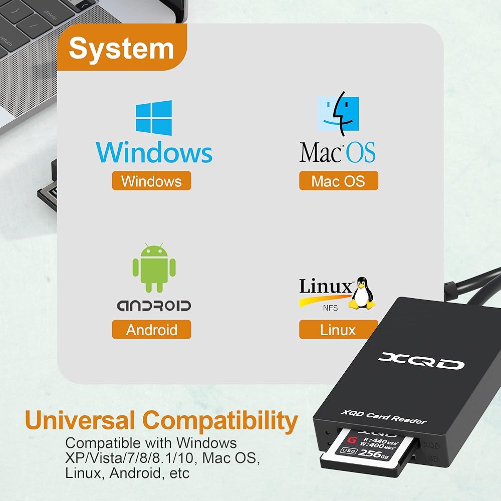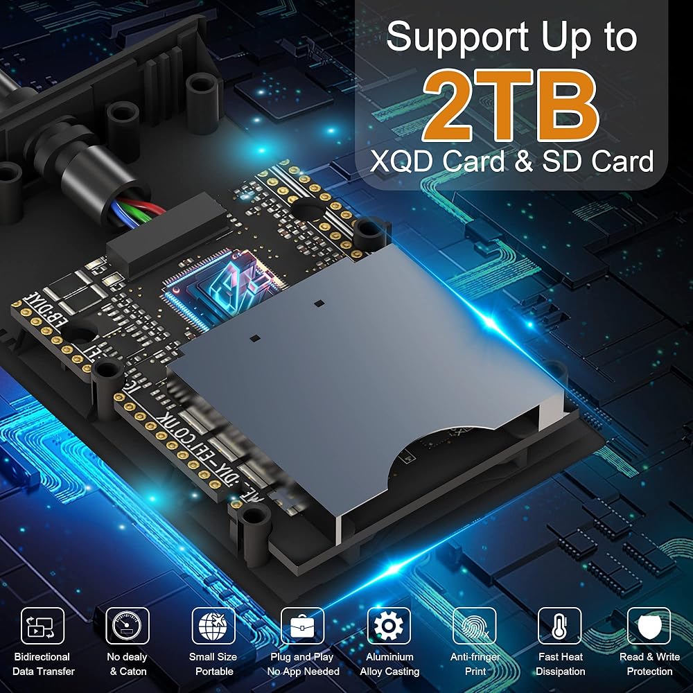 توافق واسع: للمعدات الاحترافية مثل Nikon D4/D5/D500 والكاميرات الأخرى التي تحتوي على بطاقات XQD، مثالية لسلسلة XQD Sony G-series وبطاقة M-series، Lexar 2933x، Lexar1400x Mark، سلسلة SD /SDHC/SDXC. السعة القصوى لبطاقة XQD وSD هي 2 تيرابايت. متوافق مع أنظمة Windows/Mac OS والهواتف الذكية المزودة بواجهة USB C. ملاحظة: لا تدعم سلسلة XQD N، S، H.