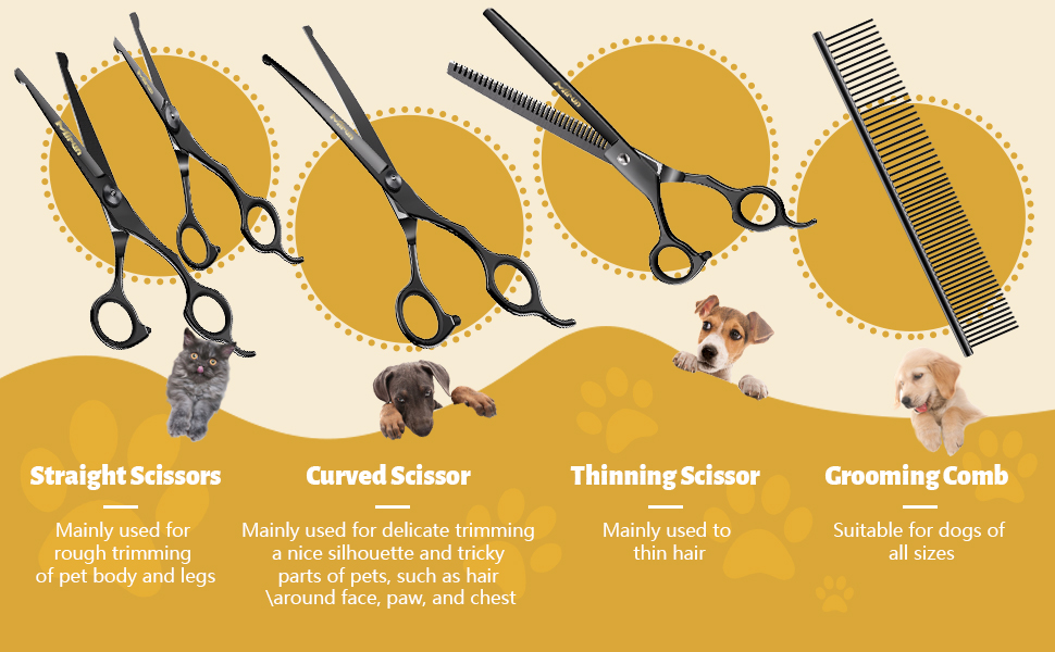 Necessary Pet Supplies -- The dog grooming scissors kit is perfect for the professional pet groomer or at-home DIY dog groomer. With the dog grooming scissors set, not only can you save the time and money of going to the pet grooming store, but it can also enhance your relationship with your pets.