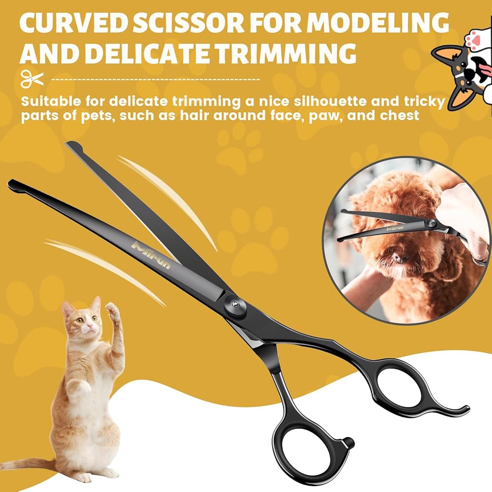 Dog Scissors for Grooming with Safety Design -- Instead of the traditional pointed tip, our dog grooming kit features a rounded tip. Don't worry about accidentally hurting your dog. We can also safely give our sensitive pets a haircut at home with the safe dog grooming scissors.