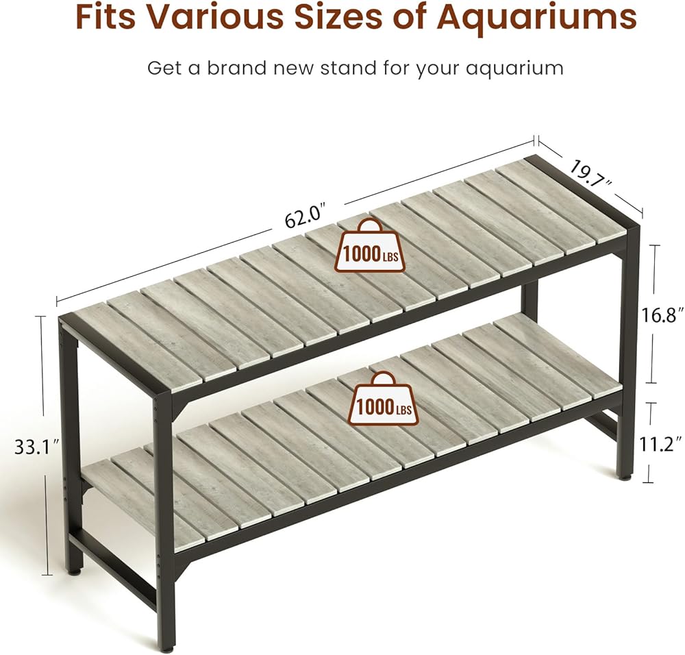 【Dimensions & Loading Capacity】Overall size: 62"L x 19.7"W x 33.1"H. This aquarium stand is suitable for 55-90 gal fish tanks or terrarium tanks with a load capacity of 1000 LBS. Whether you have a small or large tank, this stand is sure to meet your needs