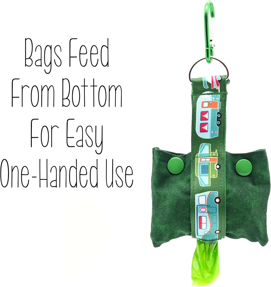 Tote clips to your belt or leash for quick access while walking. Two snaps hold the bags in place and allow for quick roll changes. Holder arrives filled with a standard roll of bags. Adorable vintage trailer and car, class B or class C camper, teardrop trailer, motorhome and pop-up tent trailer decorate the strap that covers the red crosshatch pattern bag holder.