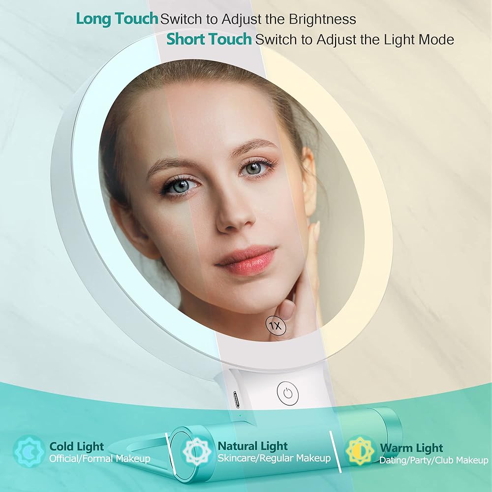 【 Adjustable Stand & 3 Colors】: Features a flexible foldaway handle. The cosmetic mirror can be hung on the wall or stand on any flat surface by adjusting the handle, and can be used as a hand mirror, tabletop mirror, and hanging mirror. 3 kinds of lights: warm light, white light, daylight, and bright light without glare, can protect your eyes. You can choose different light colors according to your needs. White light is 98% similar to sunlight, suitable for going out, natural light is suitable for office use, yellow light is suitable for parties, dinner.