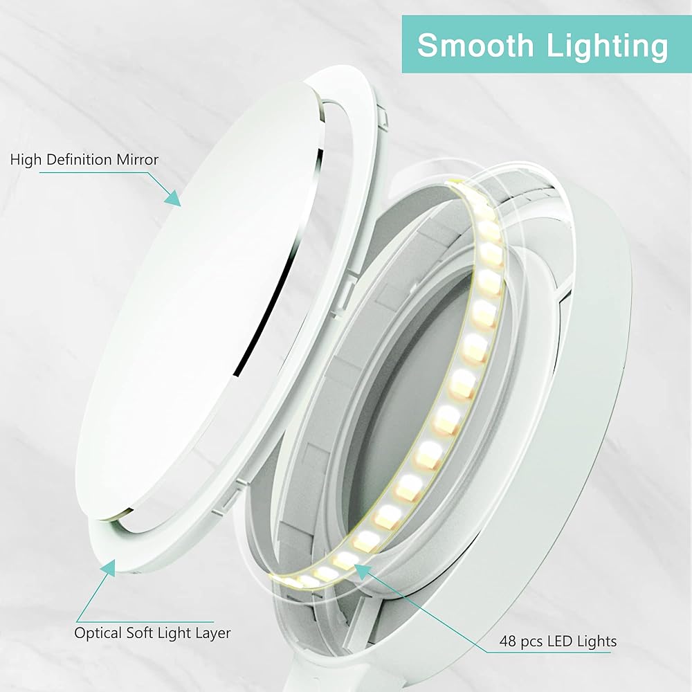 【Elegant & Portable】: Our portable travel mirror with lights and magnification has an elegant appearance, with a glossy white shell, a chrome finish stand, and a stylish modern design. The desk mirror with light weighs only 15oz/428g and is 7.08" in diameter. It is lightweight, and handy making it easy for you to put them in a handbag, shoulder bag, backpack or suitcase, and more.