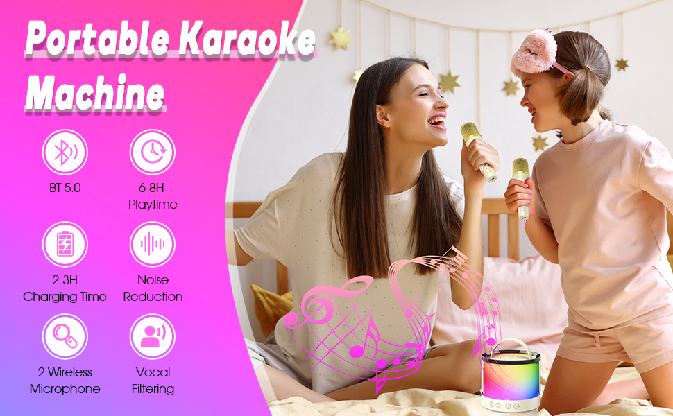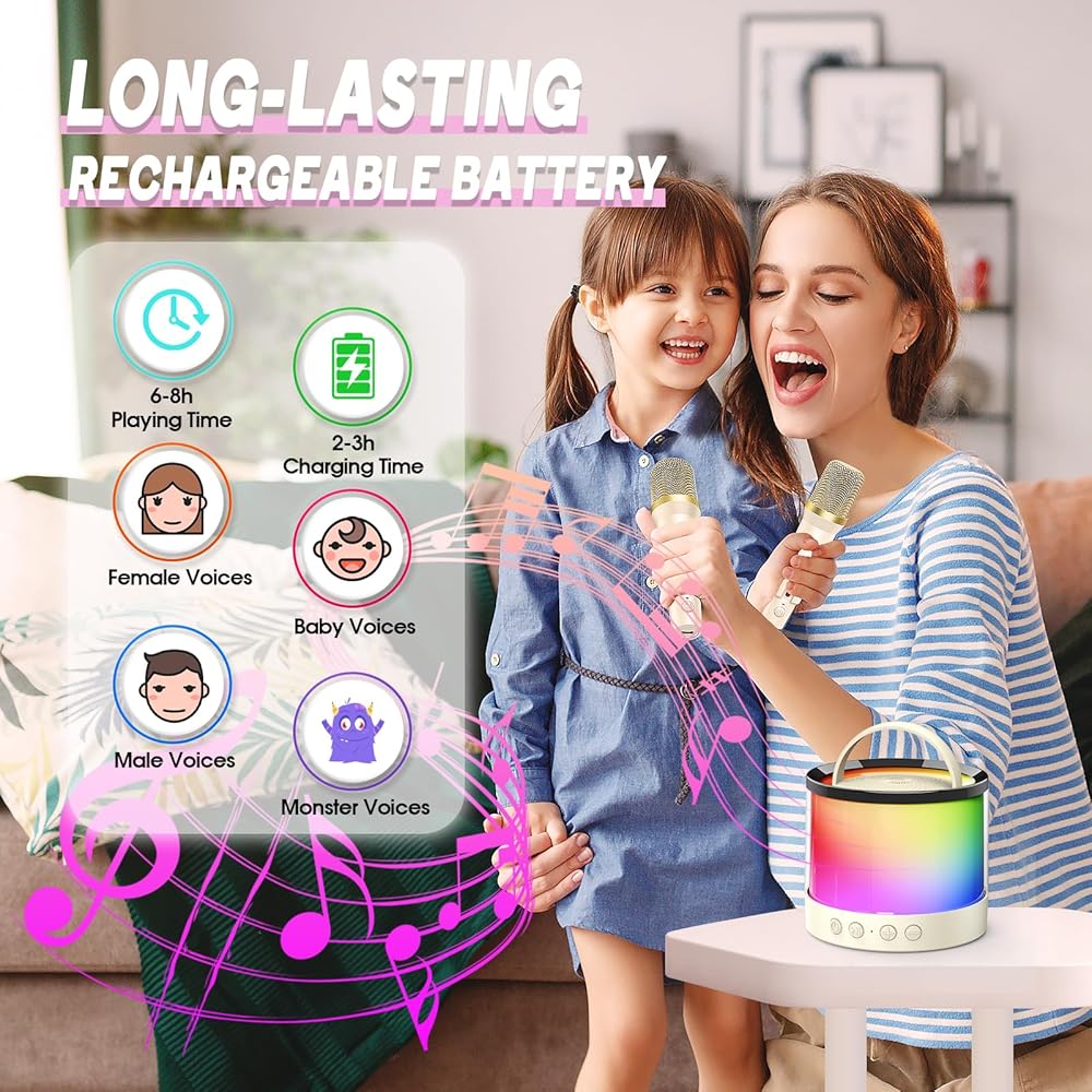 🎤Double Fun with Dual Karaoke Microphones: Enjoy double the entertainment with our Mini Karaoke Machine that boasts 2 microphones that connect automatically. With 2.4G technology, users can experience instant pairing and stable connections, which is perfect for parties and gatherings.