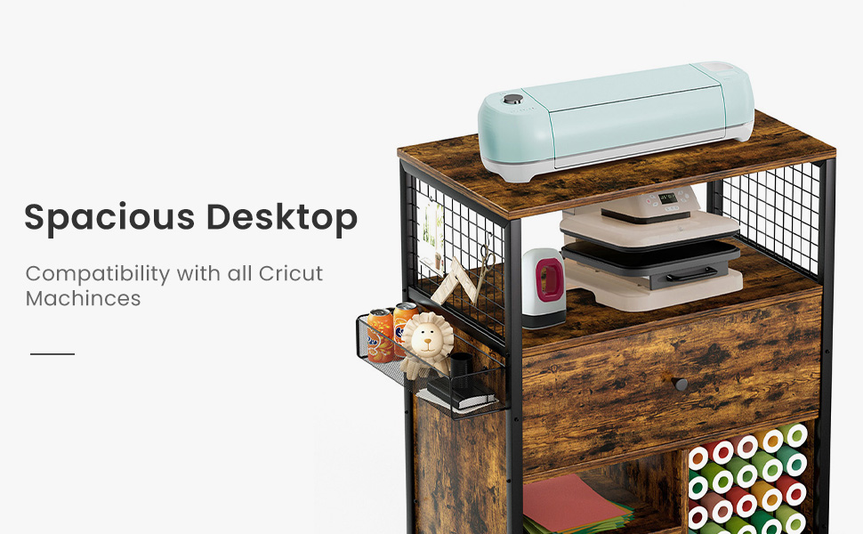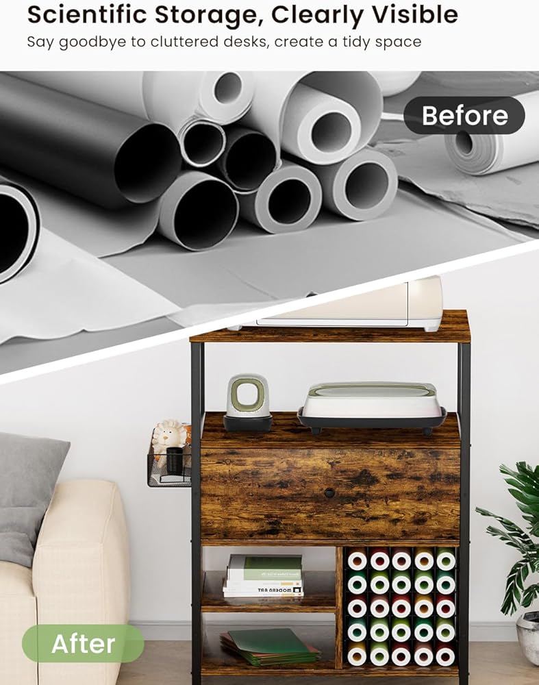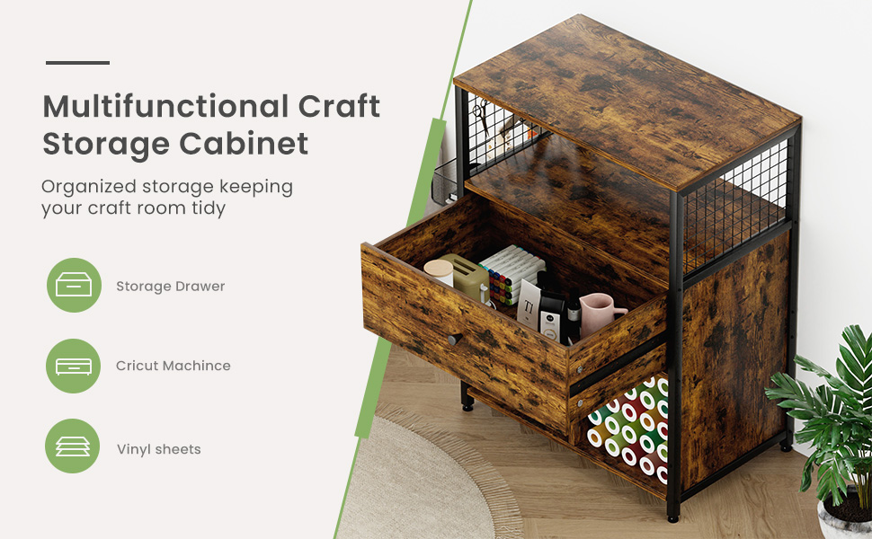 【Versatile Storage Solutions】This craft storage cabinet features two platforms and a drawer for placing items of various sizes. The side hanging basket and grid board are ideal for small item storage. The bottom of the cabinet includes dual-layer partitions and a vinyl roll storage area that can hold 25 rolls. Its versatile design allows for neat storage of both large and small tools, ideal for craft enthusiasts.