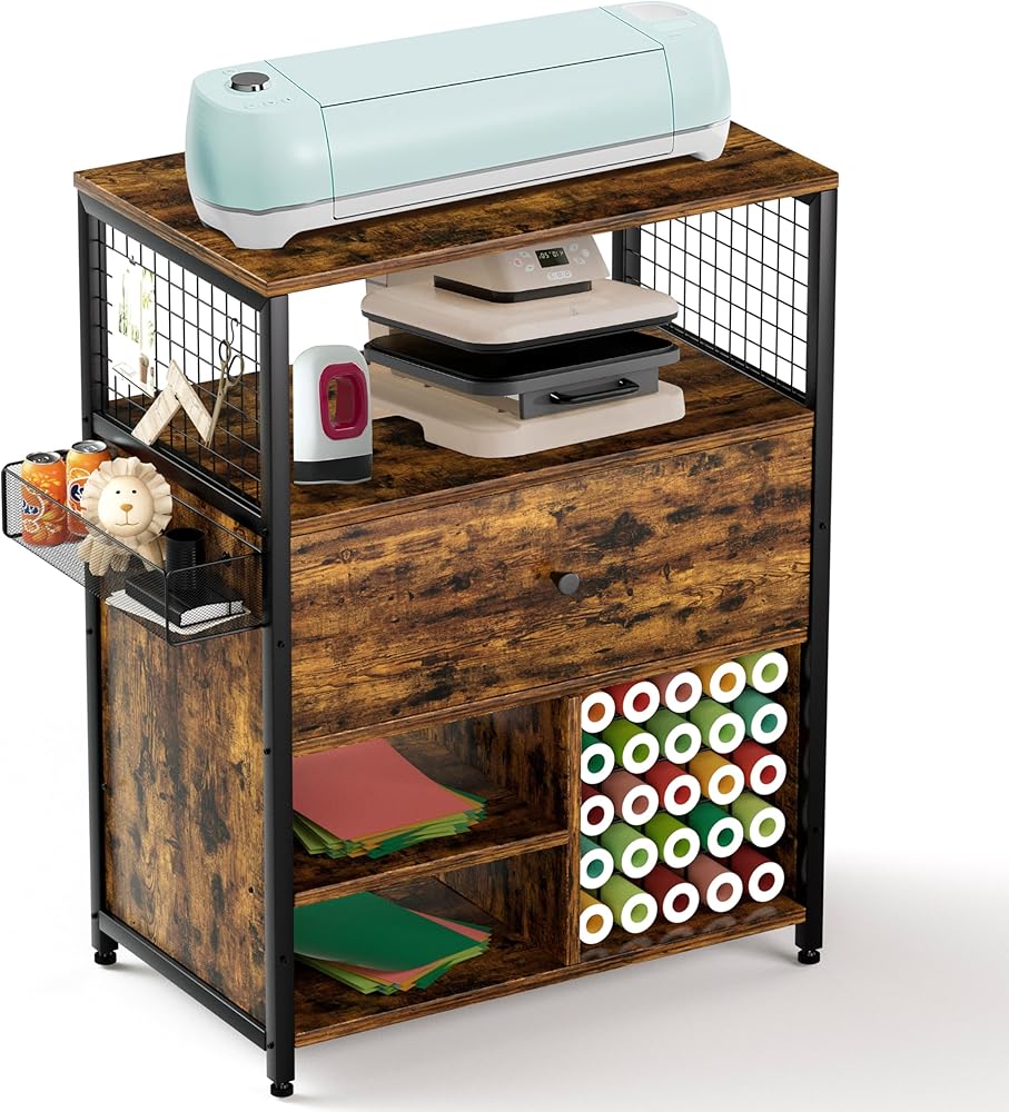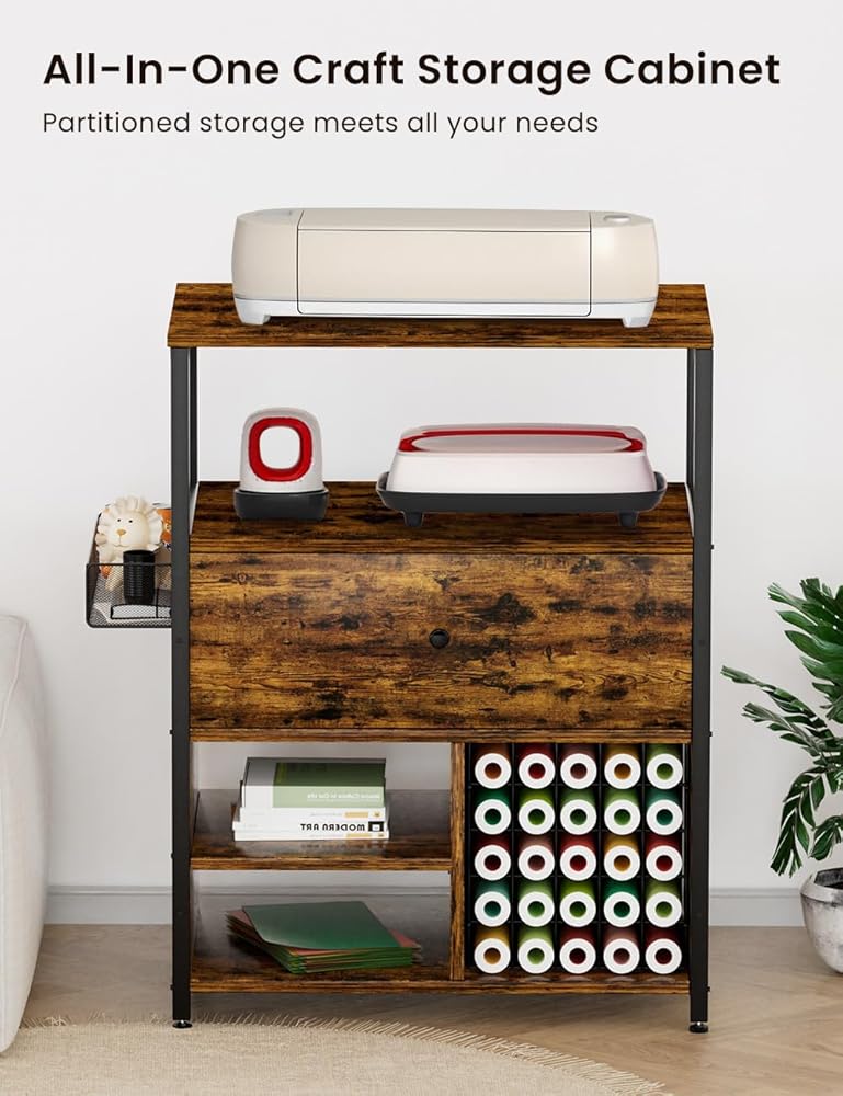 Tatub Craft Organization and Storage Cabinet Compatible with Cricut Machines, Crafting Cabinet with Drawer & 25 Vinyl Roll Holder, Craft Table Desk Cabinet Workstation for Craft Room Home