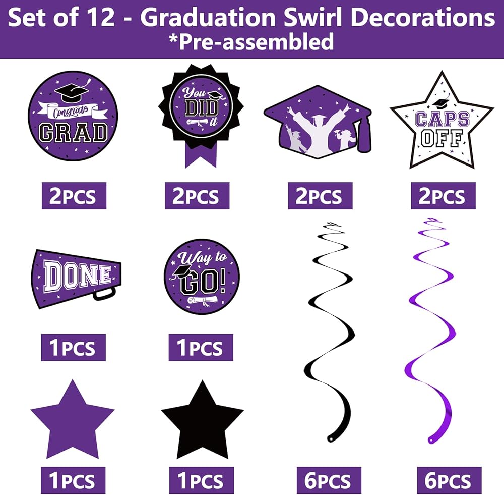 🎉Glittery Graduation Hanging Swirls: Pre-assembled 2024 graduation decor has attached plastic hooks for easy display and removal. Double-sided shimmering hanging swirls make every occasion more festive!