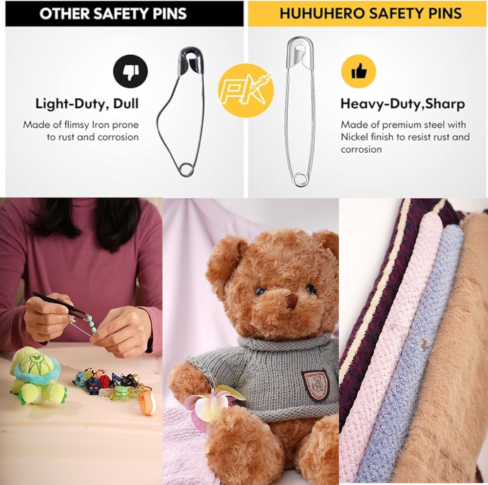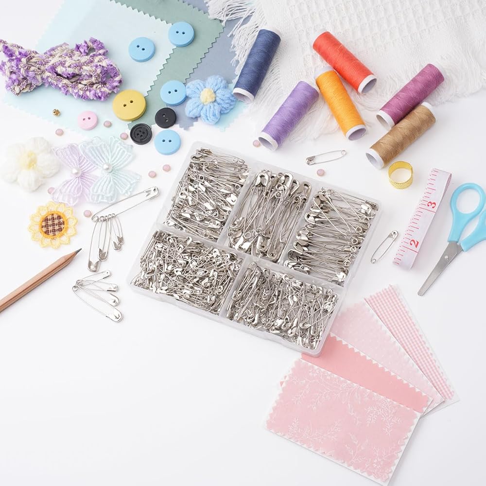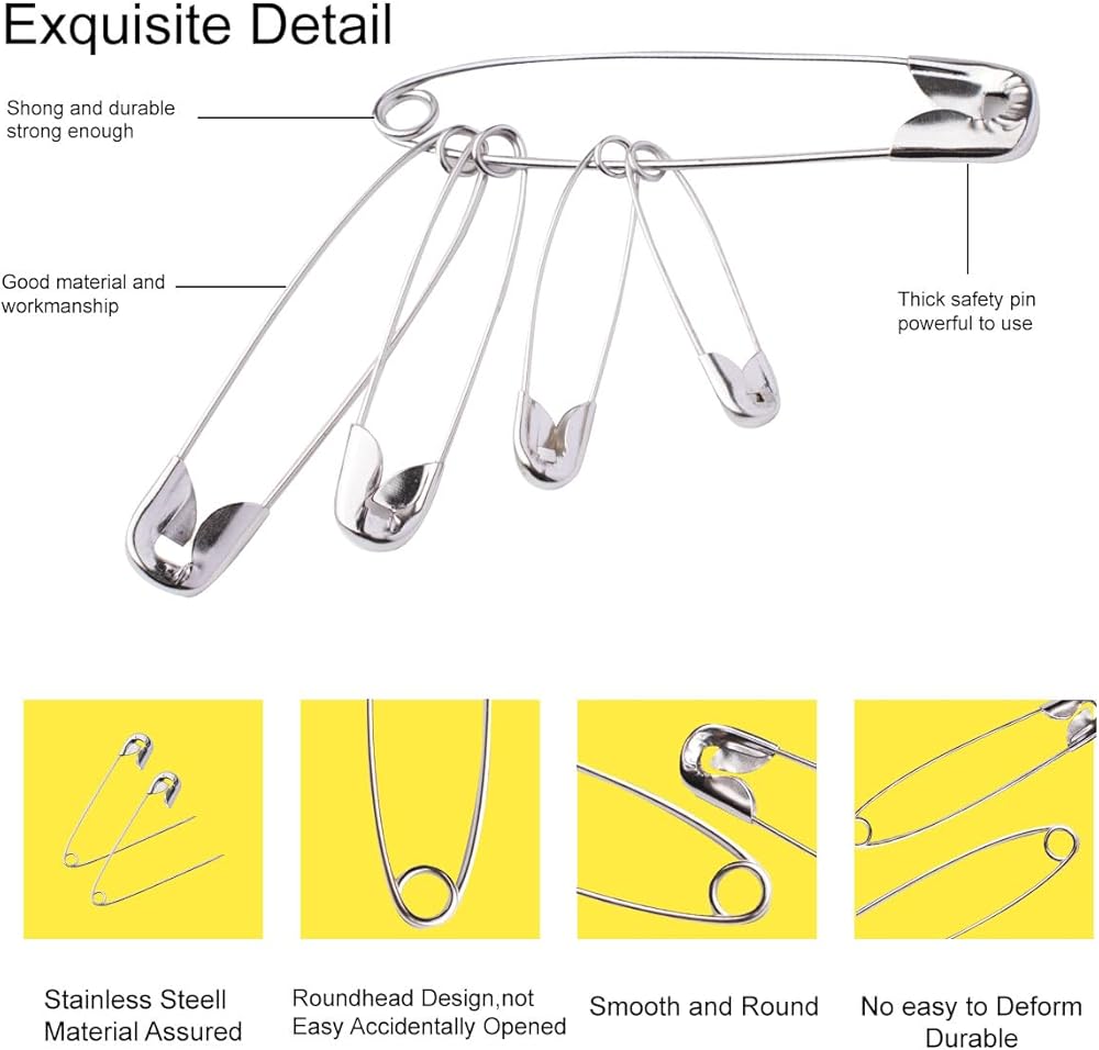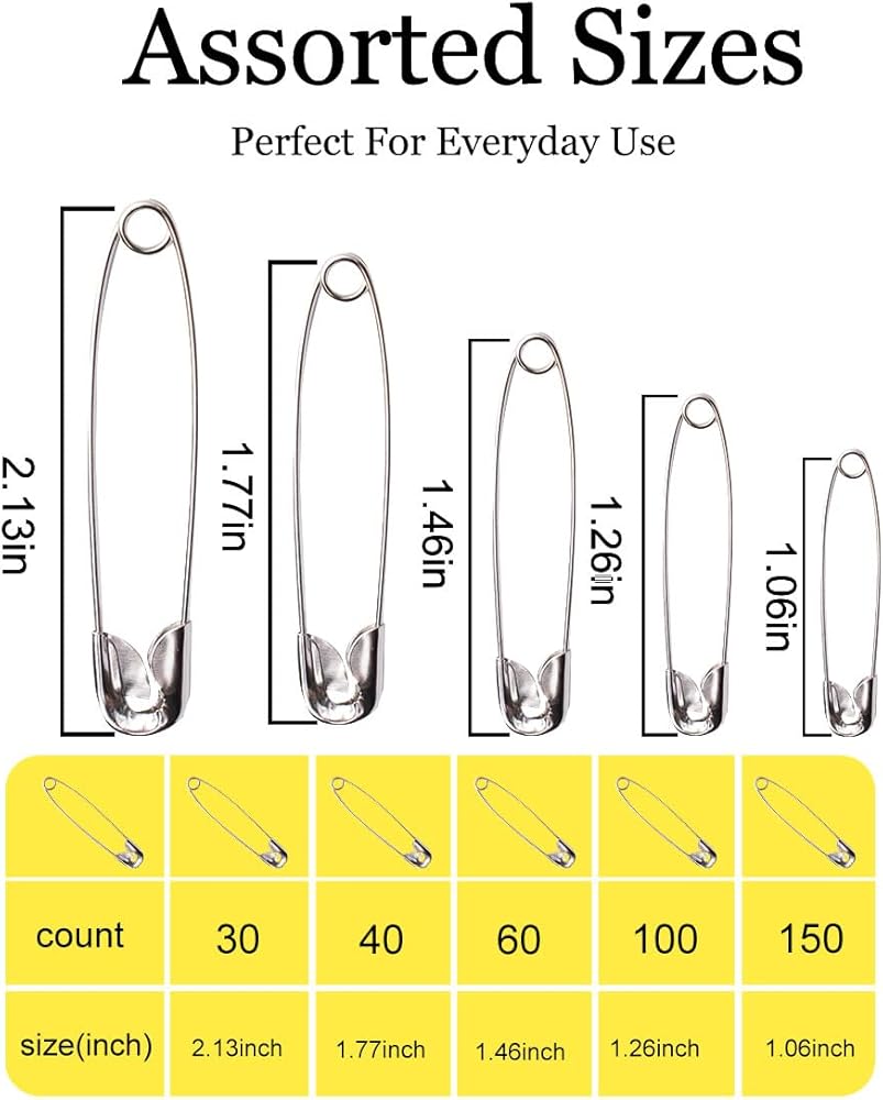 Safety Pins Assorted Pack: 5 different sizes: Our safety pin assorted kit comes in 2.13” (54mm) 30-count, 1.77” (45mm) 40-count, 1.46” (37mm) 60-count, 1.26” (32mm) 100-count, 1.06” (27mm) 150-count. Assorted safety pins ensure your creative work, sewing, crafting, dress designing is easier than ever before. Variety sizes and quantities to meet all off your needs. Easy to use.