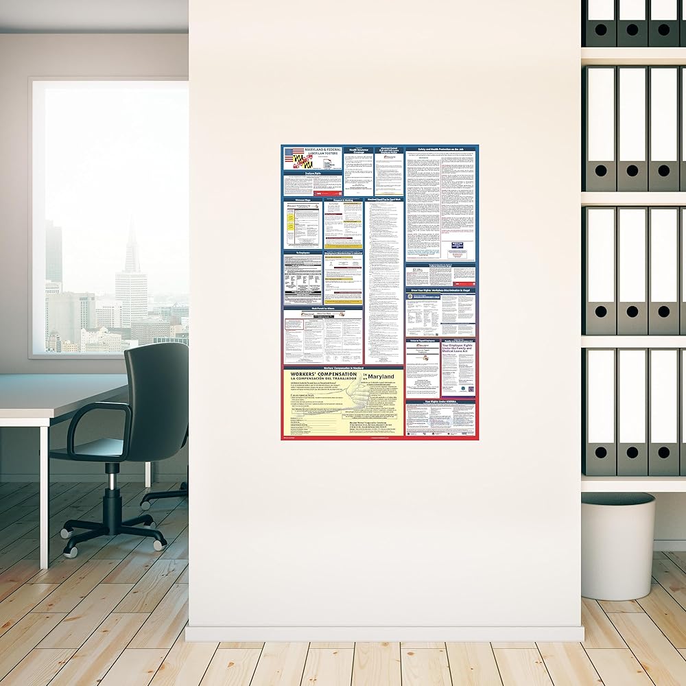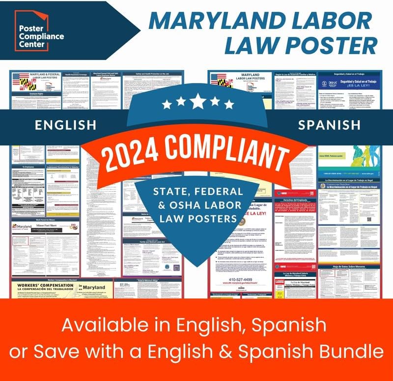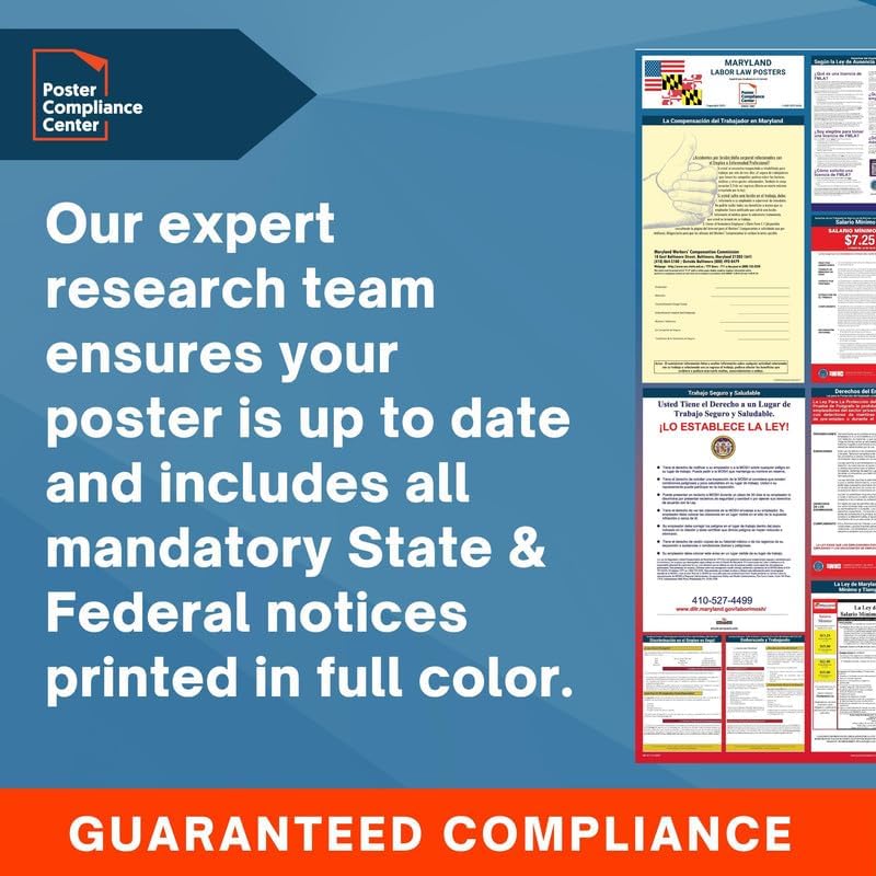 GUARANTEED COMPLIANCE & ACCURACY: Most up to date 2024 Maryland State and Federal Labor Law Poster with all notices in one simplified design. Display notices such as minimum wage, OSHA, USERRA, Workers' Compensation, FMLA, Workplace Discrimination is Illegal, and more. Our compliance notices are regularly audited - in over 30 years of business, we have never incurred a labor law violation!