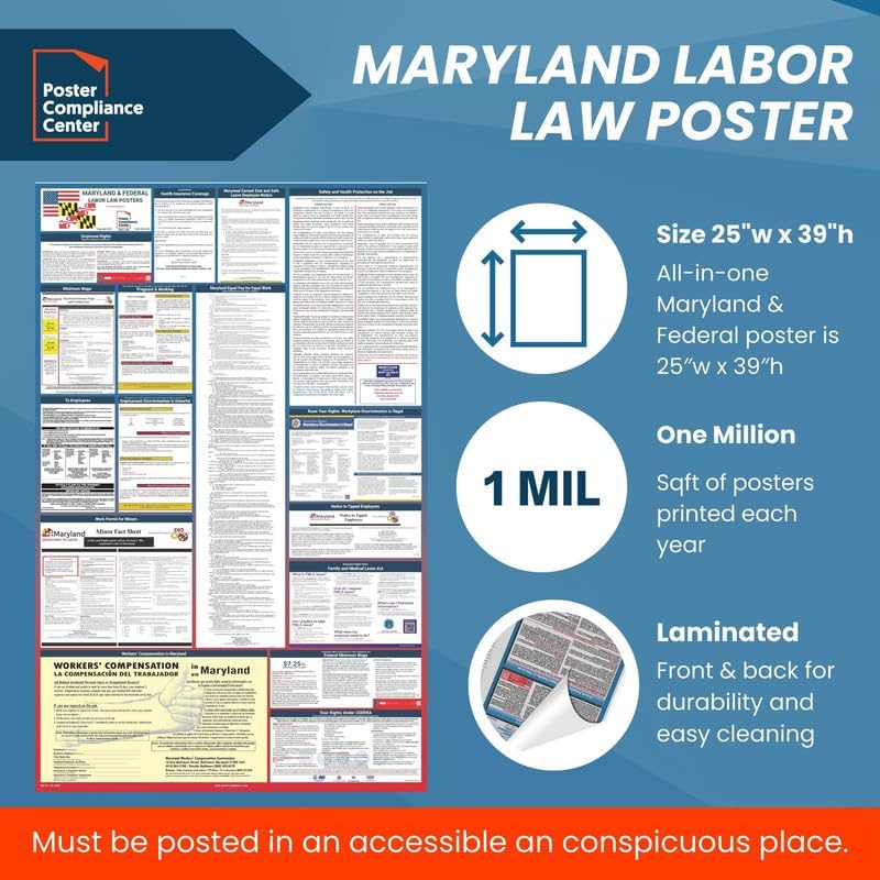 Poster Compliance Center Maryland Labor Law Poster State, Federal, OSHA Compliant, Accurate & Up to Date, Poly Paper Labor Law Poster Maryland, 19'w x 52'h (Bundle)
