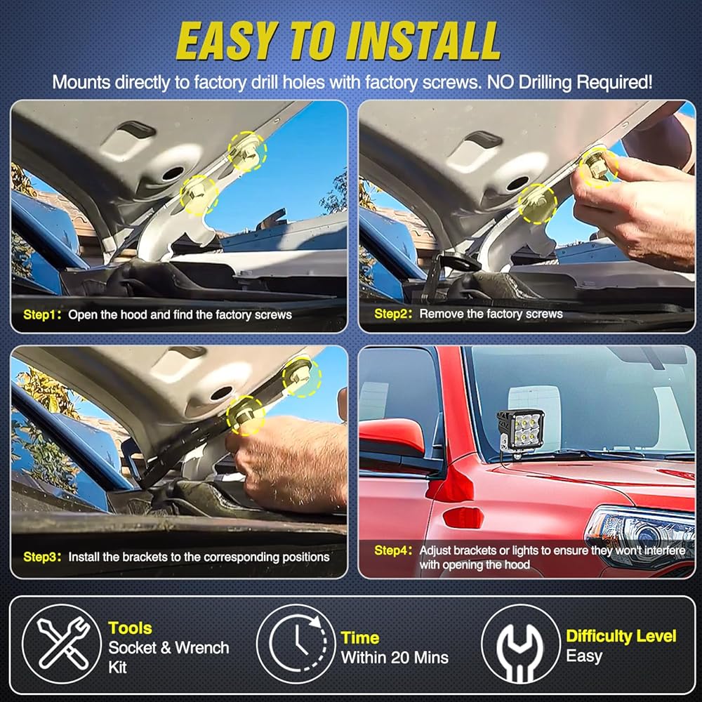 Perfect Fitment: Work perfectly with small pod lights work lights within 2” to 5” and sit at exact Position without blocking the windshield wiper or affecting the the opening/closing of the hood