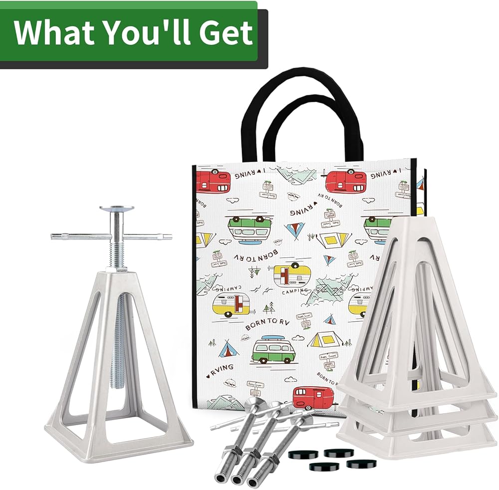 Make Your RV Stable: These RV stabilizer jacks are made of durable cast aluminum, anti-rust & corrosion resistant, with a square base design, each can support up to 6000lbs, with which you needn't worry about your RV moving or bouncing anymore.