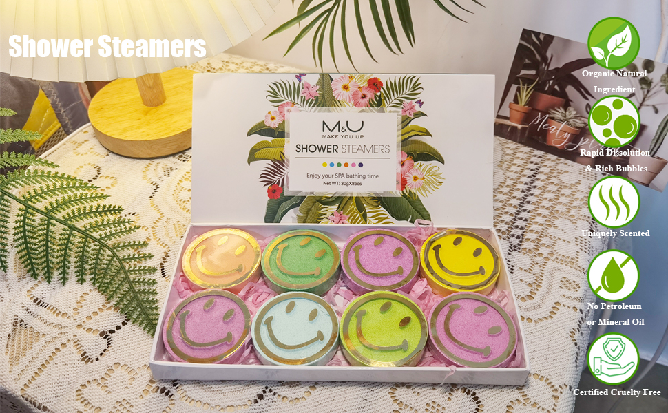 ✔ STRESS RELIEF EXPERIENC - Shower steamers set include 8pcs scented bath tablets that labeled smile face. Rose, Lemon, Orange, Lavender, Eucalyptus, Tea tree, Grapefruit and Mint. Choose the one you like according to your mood to relieve and soothe the stress of the day in the fragrance of the bath, enjoy the home spa after a day of stress.