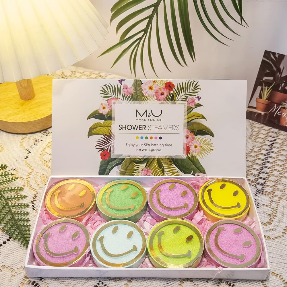 Shower Steamers Aromatherapy - 8 Pcs Smile Face Scented Bath Bomb Steamer Tablets for Shower with Pure Essential Oils, Women Stress Relief Spa Gift for Birthday, Christmas and Valentine's Day