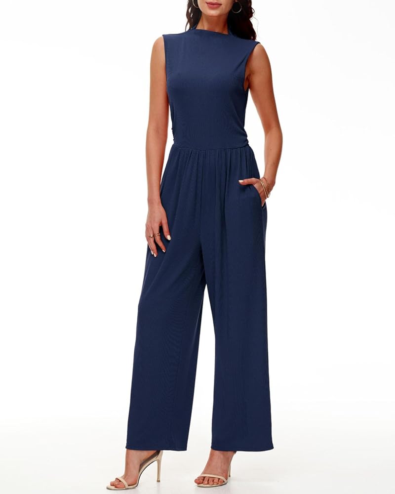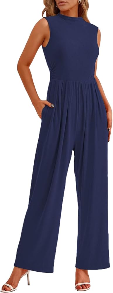 【Design Feature】Elegant mock neck, unique waist side ruching, sleeveless, wide leg pant, two pockets, solid color, and a back zipper closure. Classy and fashionable.