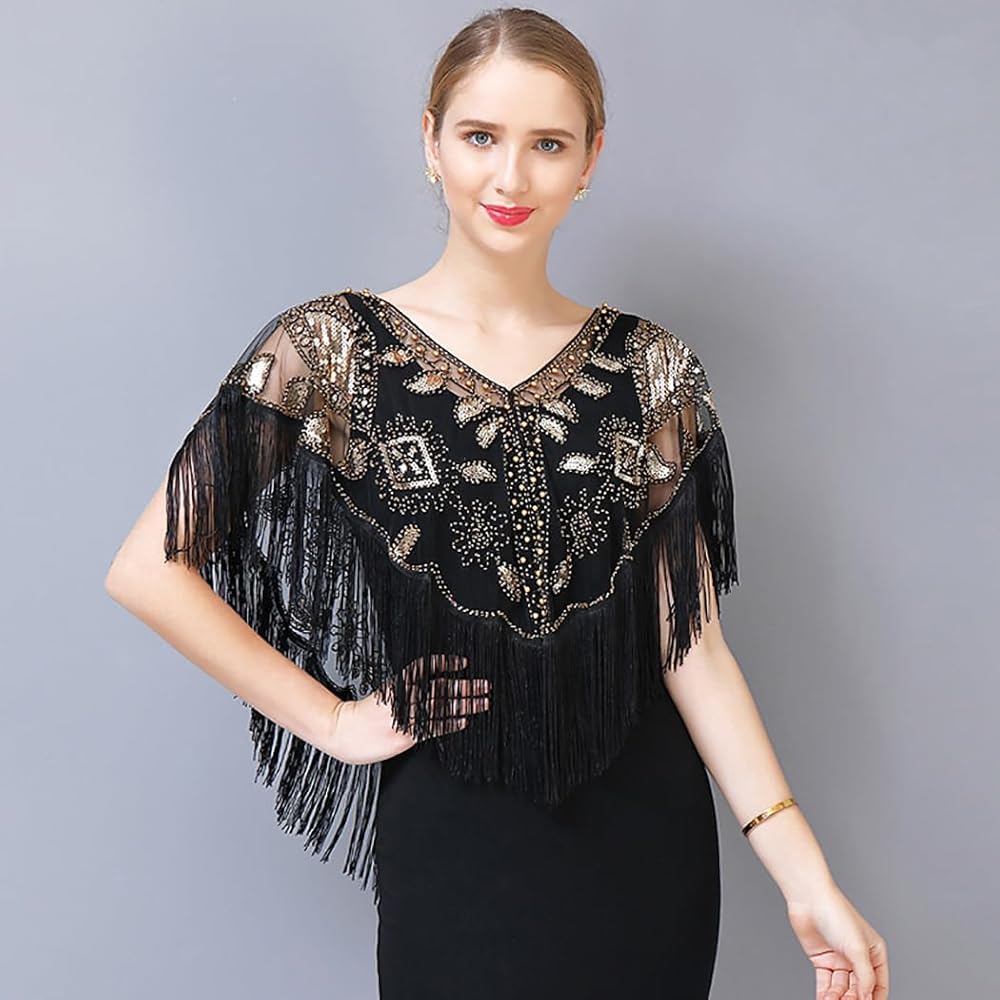 1920s Women‘s Shawl Wraps Sequin Beaded Shawls Flapper Evening Cape Feather Headpiece Pearl Necklace Earrings Long Gloves