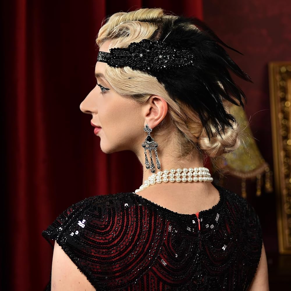 • Elevate Your Style: The feathered headband is a classic accessory that will add a touch of elegance to your hairstyle, while the vintage earrings and sparkling pearl necklace will add a touch of sophistication to your outfit.