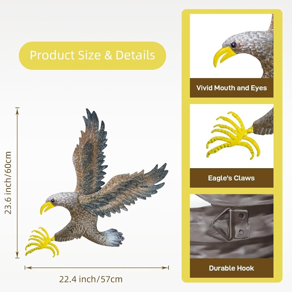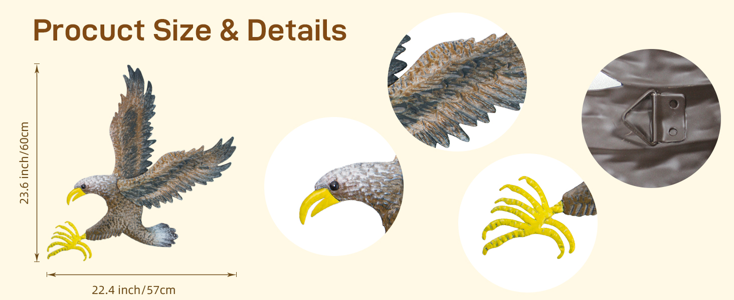🍡High Quality:The eagle metal wall art is 23.6”H and 22.4”L. Wall hangings is divided into three parts. First, assemble the upper half of the wings, press them tightly, and then install the lower half of the wings.