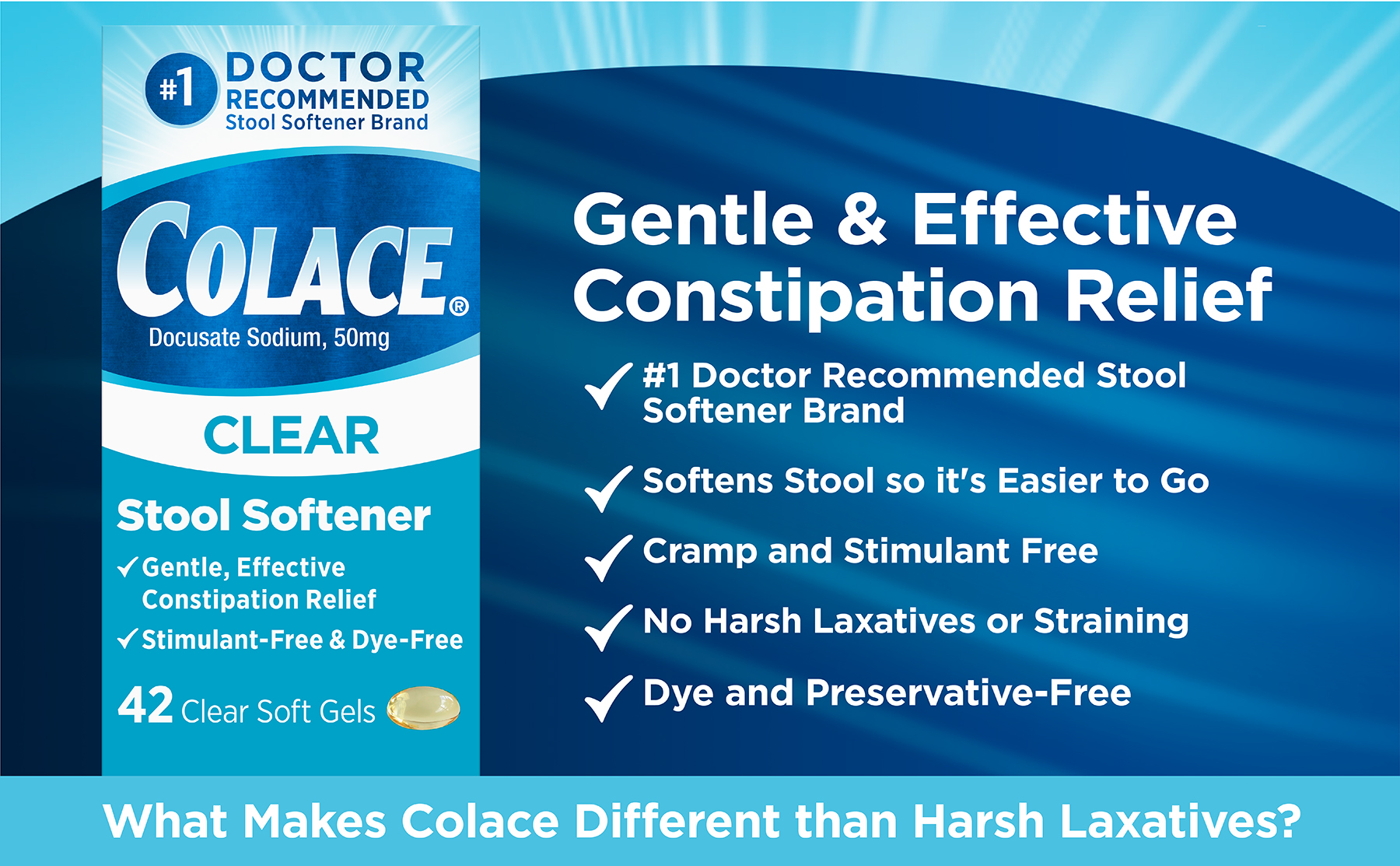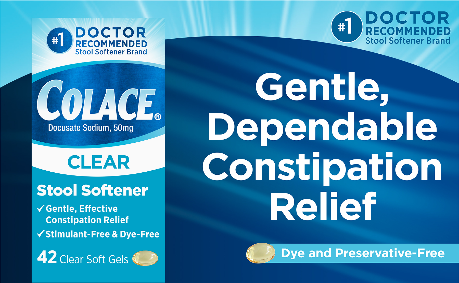 Colace Clear Stool Softener 50 mg Soft Gels, 42-count Colace Capsules are the 1 stool softener brand recommended by doctors for comfortable relief from occasional constipation. Colace Clear Soft Gels are Dye-Free and Stimulant free for comfortable relief. The lowest available strength of Colace for patients who prefer to begin with a lower strength (50 mg as compared with 100 mg) Colace has been trusted by doctors and patients for nearly 50 years to relieve occasional constipation. Stool softeners like Colace may be particularly beneficial in patients who are recovering from surgery, women who are post-partum, or individuals who suffer from conditions like hemorrhoids where straining during bowel movements is to be avoided.